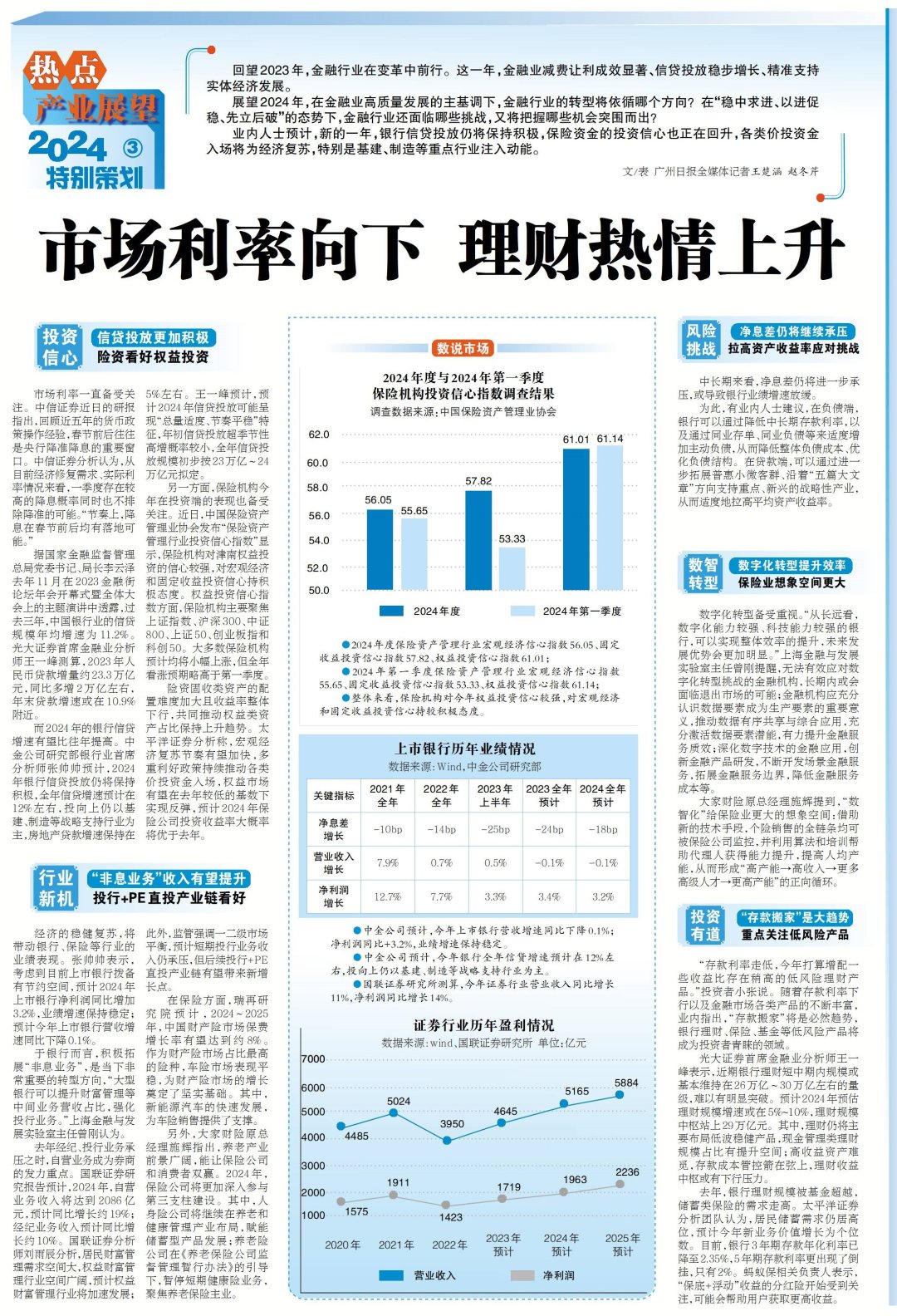 经济的稳健复苏,将带动银行、保险等行业的业绩表现。张帅帅表示,考虑到目前上市银行拨备有节约空间,预计2024年上市银行净利润同比增加3.2%,业绩增速保持稳定;预计今年上市银行营收增速同比下降0.1%。