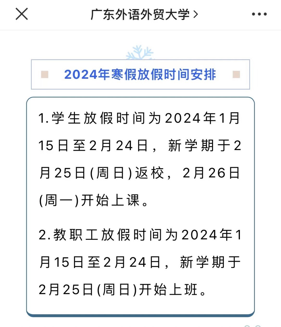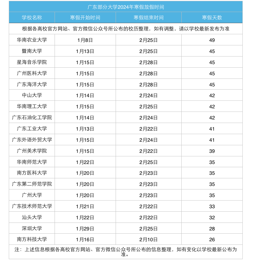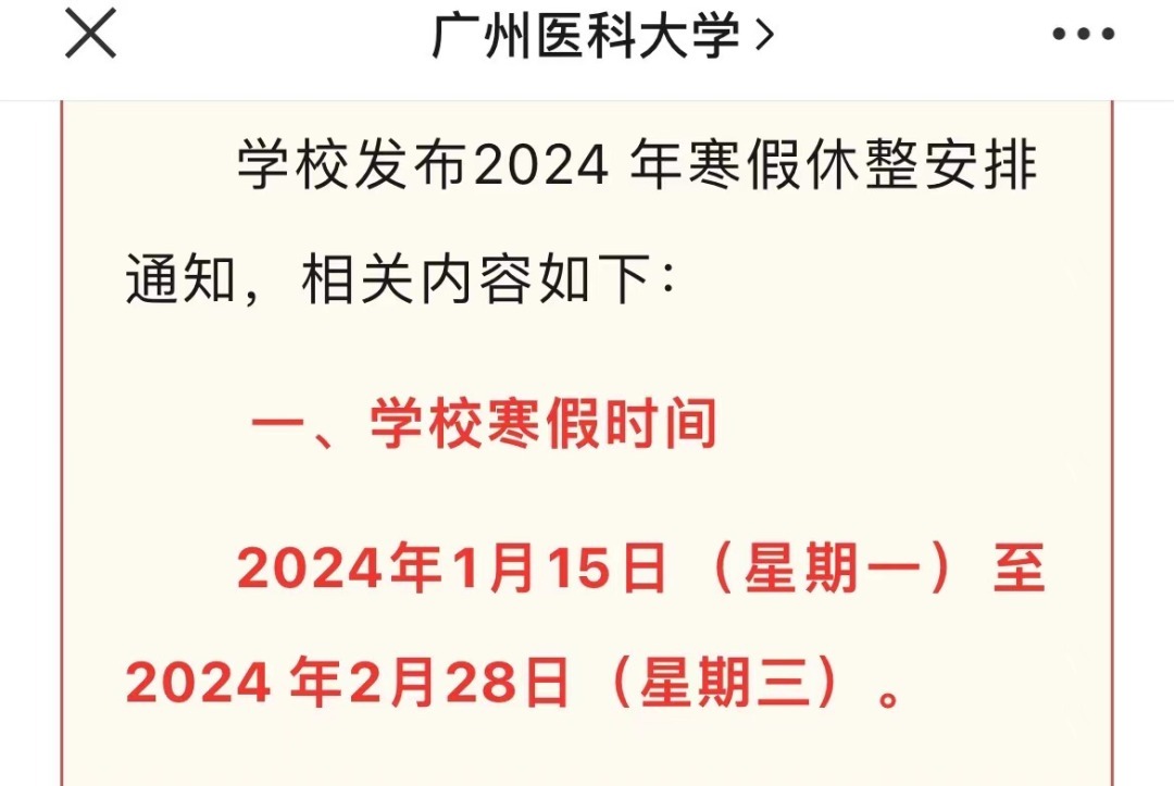 近日,暨南大学、华南师范大学、广州医科大学等多所广东高校公布了2024年寒假放假时间安排。