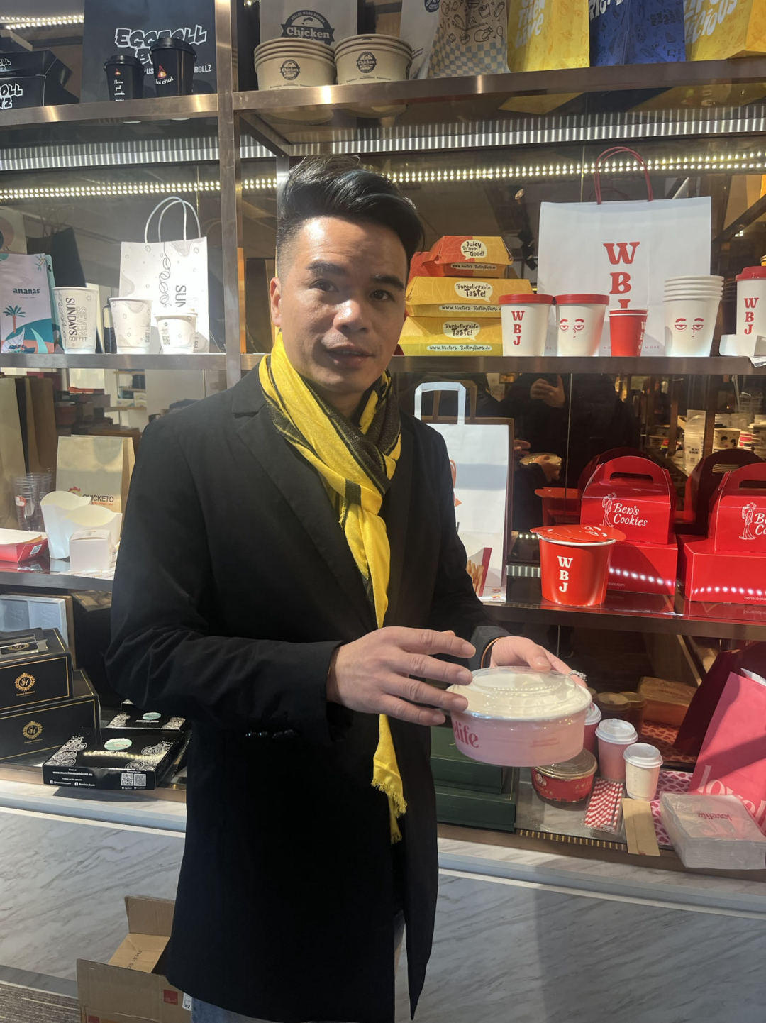 陆鹏毅向记者介绍如何避免食品过度包装的有关措施