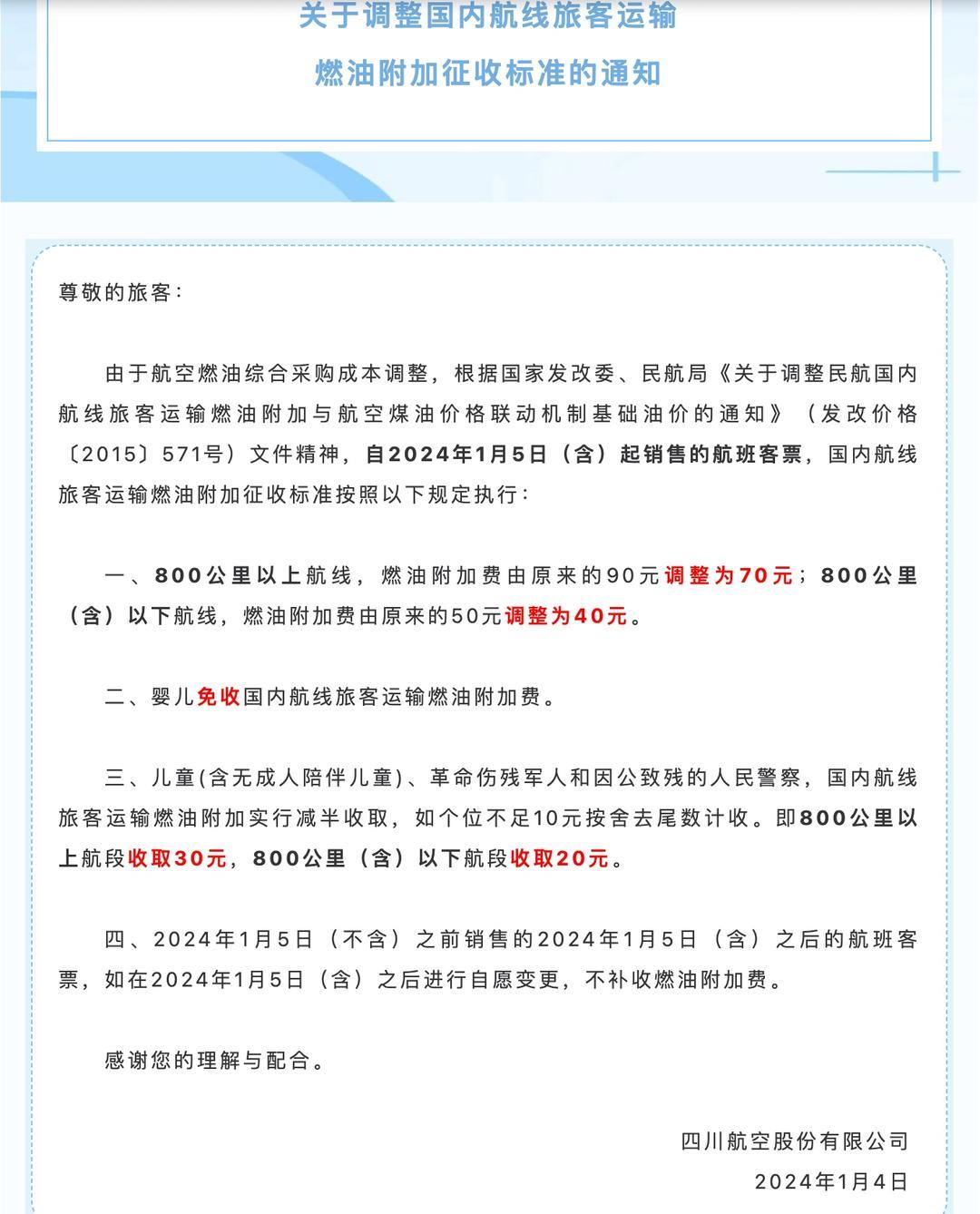 1月4日当天,川航发出通知称,由于航空燃油综合采购成本调整,根据国家发改委、民航局关于民航国内航线旅客运输燃油附加与航空煤油价格联动机制相关要求,自2024年1月5日及以后销售的航班客票,调整国内航线燃油附加征收标准。