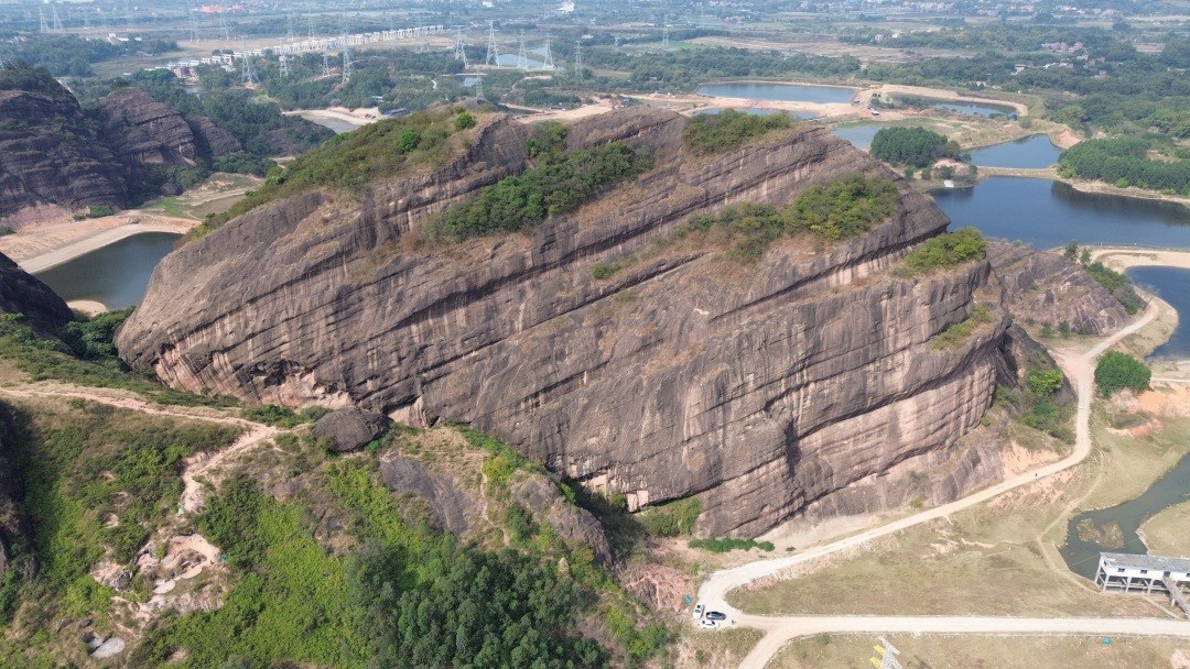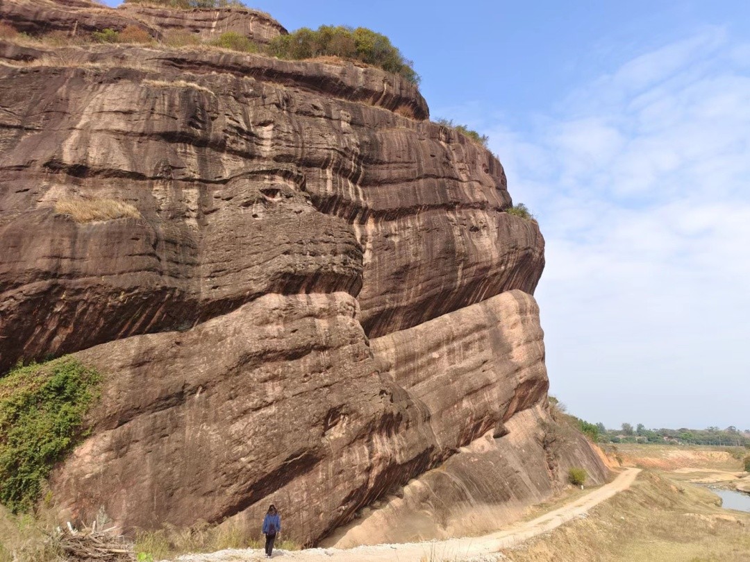 大神石之所以神,应归咎于它是独岩成石,一百多米高的“山”其实整个就是一整块丹霞砂岩构成,孤零零的,东面为百米高的悬崖峭壁,刀削斧劈拔地而起,仅在岩石顶堆积了薄薄的覆土,寄生了杂草植被,也有桃金娘,俗称稔子树。远远望去,巨石犹如浮出深海的巨无霸蚌壳,爬在沙滩上,岩石上有层层侵蚀的凹槽环绕,大的就像裂开的蚌壳嘴,朝向广袤的田野。