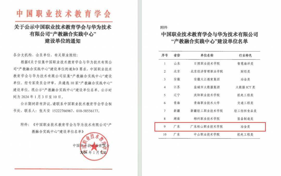 记者今天了解到,广东松山职业技术学院近日入选中国职业技术教育学会与华为技术有限公司“产教融合实践中心”建设单位。