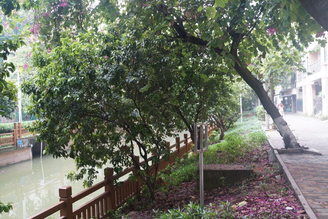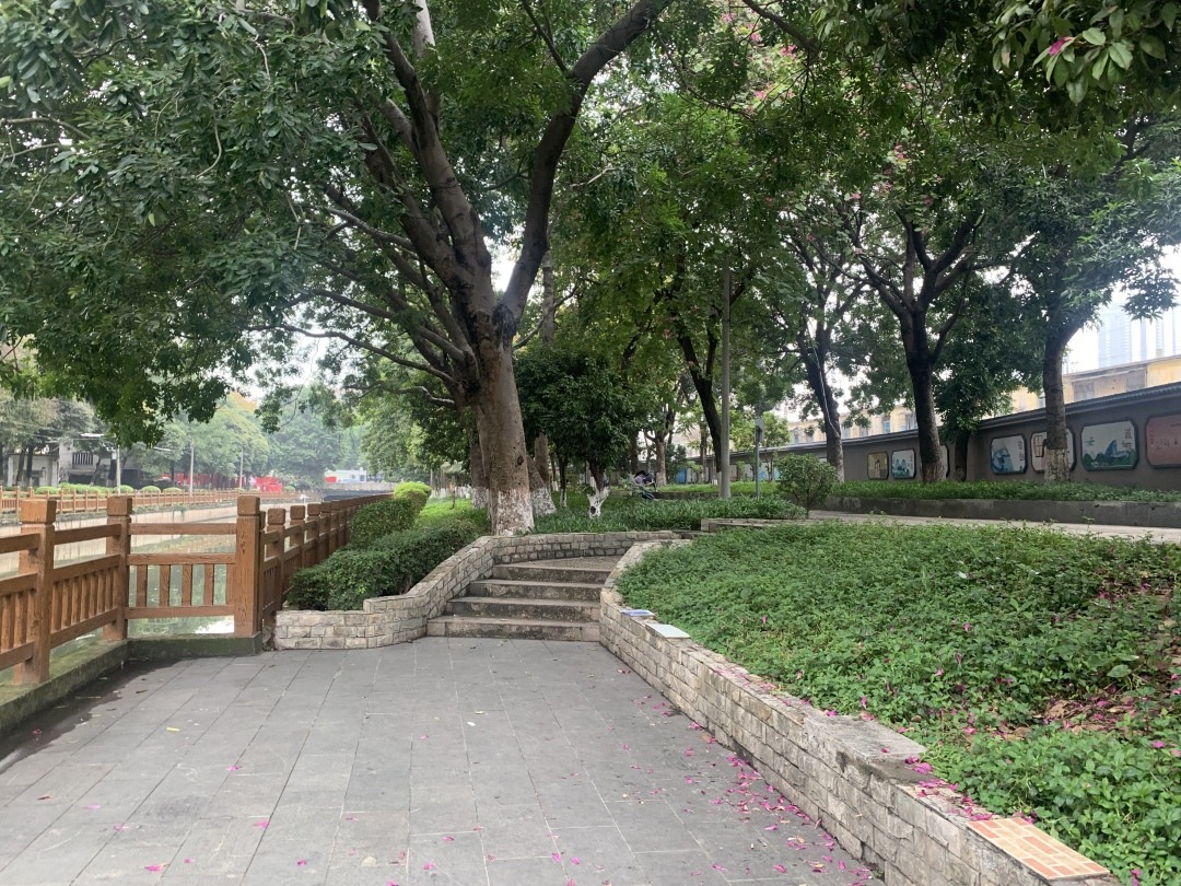 驷马涌沿岸原本植被密集,有荔枝树、紫荆树、凤凰木等大型乔木,此次涌边绿化提升对原有树木进行严格保护,主要采取“乔木+草坪”的种植模式,保留原有乔木,整理杂乱的灌木丛。改造遵循原有堤岸坡度,空间布局自然舒缓,局部河涌段植入超长延续的海绵草阶、海绵梯田,打开涌边视野,滨水绿地整体呈现疏朗开阔的疏林草地景观,此外,融入海绵城市理念,植入透水铺装,设置下凹式绿地、植草沟、跌级花池、溢流井等海绵设施。届时紫荆绽放、凤凰花开,驷马涌畔俨然一派红云绿岸,再现昔日岭南水岸风光。