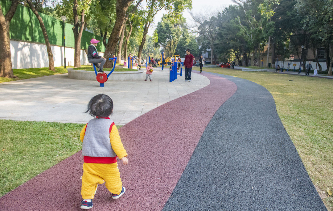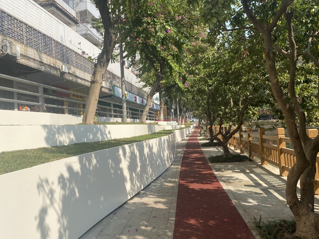 类似的“绣花”功夫还体现在“坐”上。“我们还将边坡的挡水石设计成400 mm到450 mm的高度,形成连贯的坐凳,一些花基、台阶上也有类似设计,以此增设坐凳850米,确保群众行走时可以随处坐下休息,既节省了资金,降低了设施管护成本,又增强了设施使用功能。”杜凡表示。