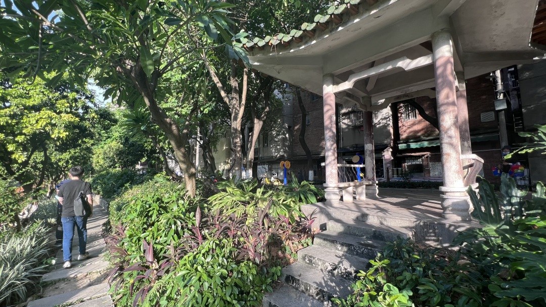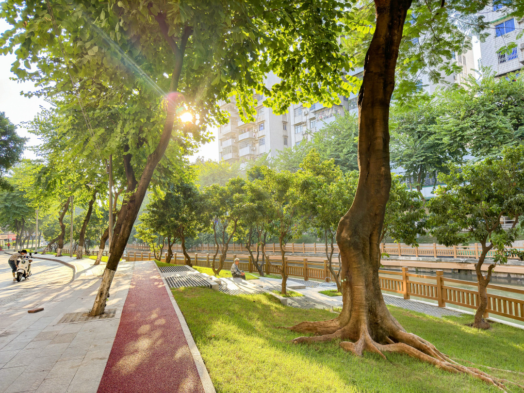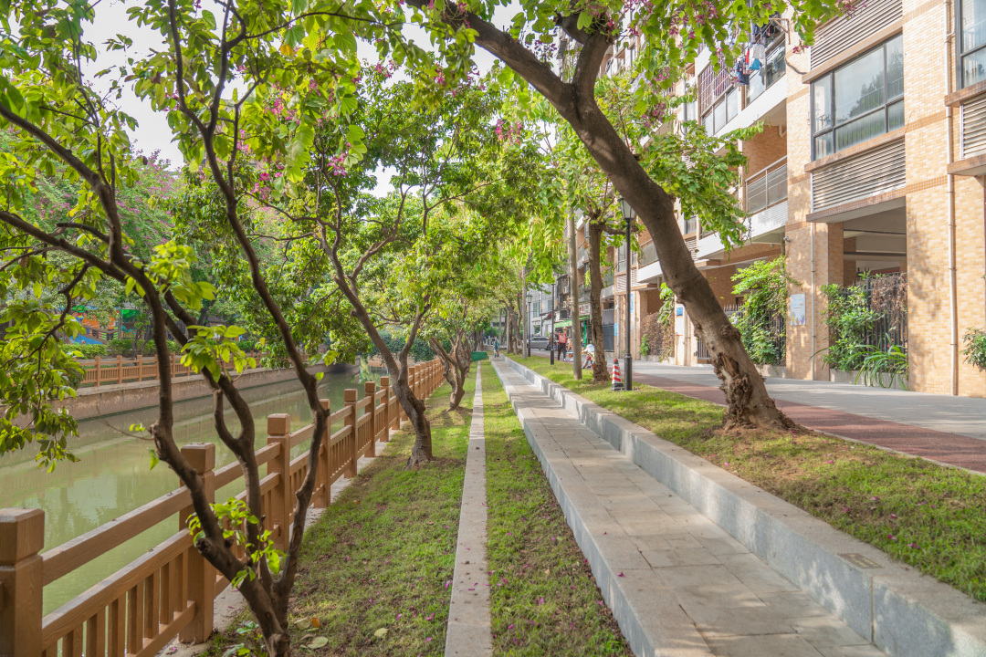 位于涌边的周门荔枝湾西苑处,巷口有一株古榕树。值得一提的是,此次滨水环境改造,对这株古榕树进行了重点保护,为解决古树周边空间局促、高差大、路段人车拥堵等问题,设计方精心设计曲型彩虹梯田,消弭陡坡高差带来的压抑感,弯弯曲曲的绿化带外沿也为避让沿岸树木而变窄的漫步道让出一定空间,成为一处景观与功能恰当融合的代表性空间。