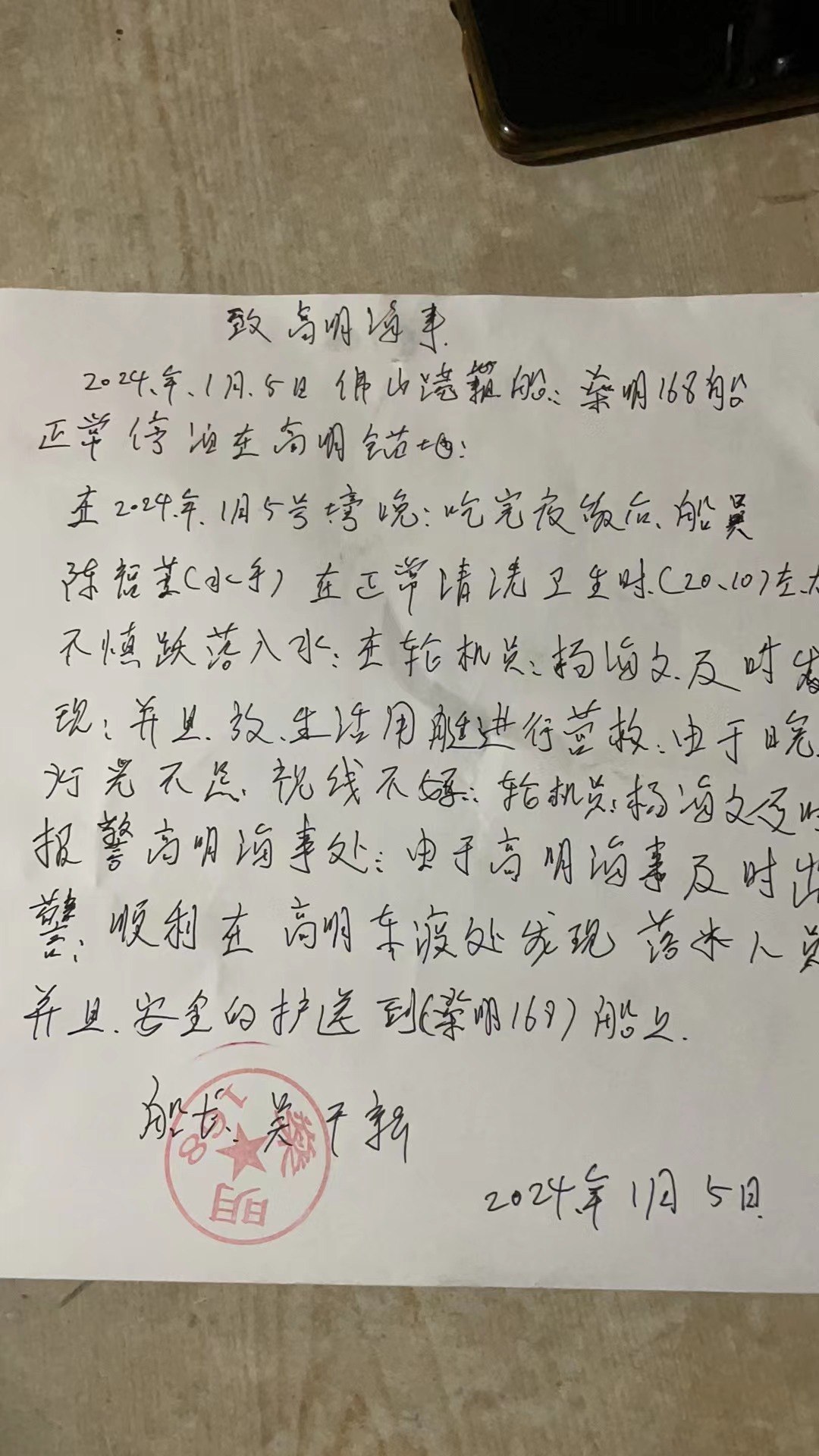 “高明海事、高明海事,快救救我老婆!”,1月5日晚上8点50分,高明海事处接到一通急促报警电话。“我老婆不见了,只看见下面有水花,听到呼叫声,应该是落水了,需要你们救助...”报警人员情绪激动,甚至一度将出事船名念错。接警人员经详细了解,该船名为“燊明1**”船,停泊高明荷城片区水域,发生了人员落水事件。