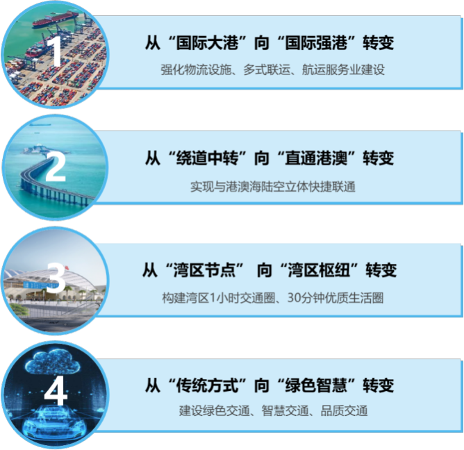 《规划》以“湾区交通中枢、通江达海门户”为目标,从面向世界、协同港澳、立足湾区、同频广州、服务未来等5个维度提出了具体任务与行动计划,推动南沙从“湾区地理几何中心”向“湾区交通中心”转变,有力支撑南沙建设成为立足湾区、协同港澳、面向世界的重大战略性平台。