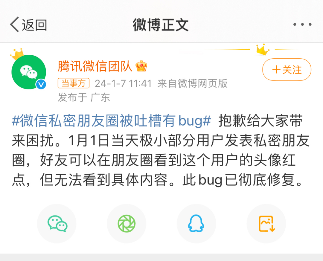1月7日午间,腾讯微信团队在微博发文,对微信私密朋友圈bug发文致歉,“抱歉给大家带来困扰。1月1日当天极小部分用户发表私密朋友圈,好友可以在朋友圈看到这个用户的头像红点,但无法看到具体内容。此bug已彻底修复。”