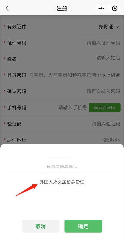 3、有效证件类型选择“外国人永久居留身份证”,填写相关必要信息后完成账号注册;