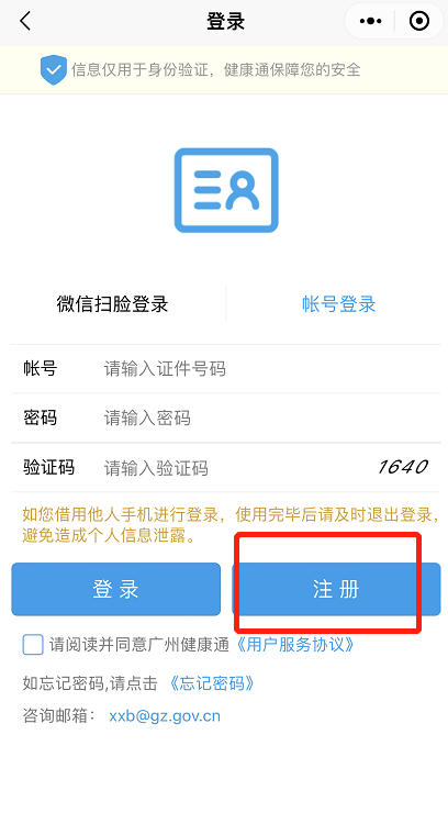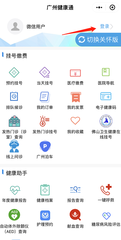 2、在“广州健康通”微信小程序首页点击“登录”,登录页选择“注册”功能;