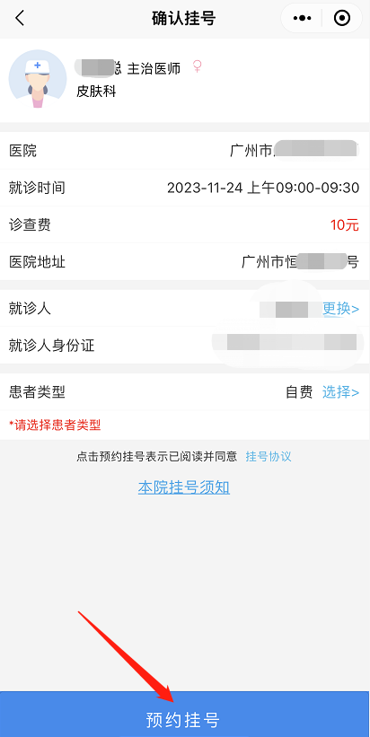 4、账号注册后开始进行预约挂号,点击“预约挂号或当天挂号”功能,依次【选择医院】-【选择科室】-【选择医生】-【选择号源】,确认相关信息后点击“预约挂号”按钮完成挂号。