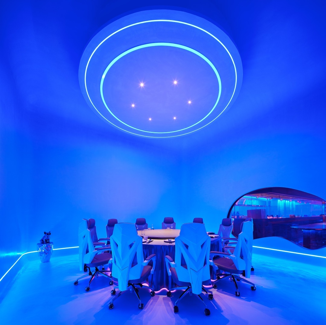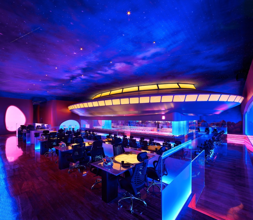 近期,广州新添了不少“沉浸式餐厅”,吸引了一众年轻人打卡。中华广场的日式餐厅“银河铁道物语”,食客进入后仿佛置身宫崎骏动画电影的旧式列车之中,复古又温馨。像是老牌粤菜惠食佳便开设了名为“啫八”的餐厅,装修得十分赛博朋克,大有科幻片即视感。从进门就开始仿佛步入太空舱,进入餐厅后,即刻切换为宇宙蓝,墙壁上是星球的影像,天花板上时不时有流星飞过,餐厅的明档做成飞船样式,厨师们正在舱内忙碌。飞船厨房外围着一圈单人座椅,更能适应年轻人一人食的需求。包间的风格以未来感和简洁感为主,大量铺设纯白以及高饱和度的粉色,灯光则可以随意调整颜色,用的椅子甚至是电竞椅。
