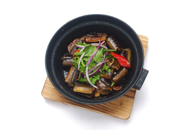 啫八不仅装修硬核,菜式也很硬核。菜品和惠食佳基本相同,啫啫煲是主打,其中不乏许多创新啫煲。啫啫煲的特点是外焦里嫩,使食物外表焦香,内里极大程度的保留其鲜味和本真。这一形式的烹饪时间极短,靠大火将酱汁逼入食物内里来入味,也使得整个过程是厨师与火候的较量。食物“啫”个七八分熟便开始上桌,厨师在锅盖上浇一勺料酒,以便产生强烈的镬气。上桌的过程中,烹饪仍在继续,待到端到食客面前揭开锅盖,猛烈的镬气四散开来后,食物才完美亮相。