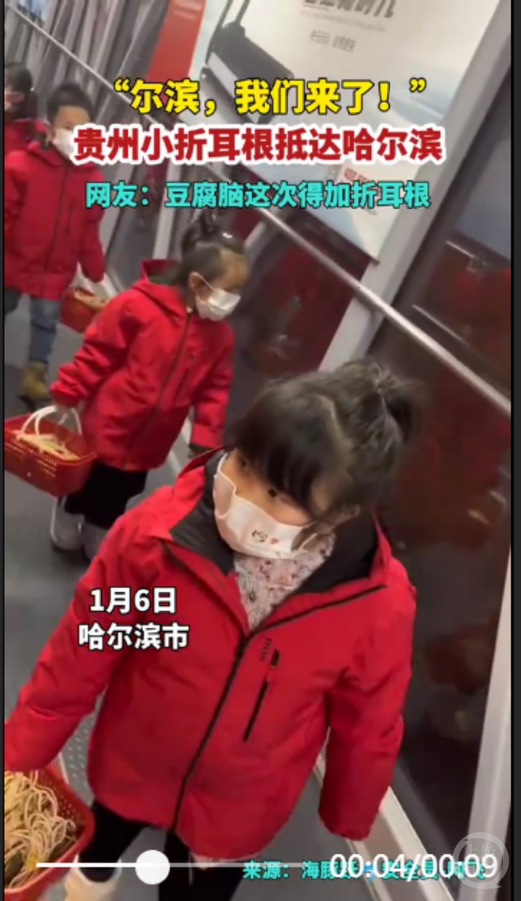 1月6日,穿着整齐的红色“队”服,被网友们爱称为“小折耳根”的10名贵州小宝贝平安到达哈尔滨机场,他们下飞机时每人都还提了一筐折耳根,他们热情地和接机的叔叔阿姨们打招呼。据悉,孩子们将在哈尔滨游学7天。