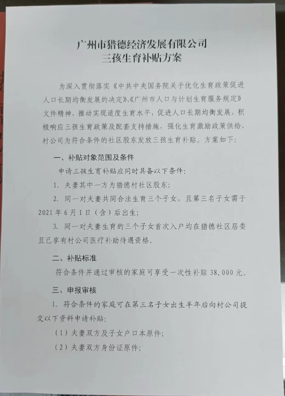此前,猎德村还发布了《广州市猎德经济发展有限公司三孩生育补贴方案》,根据方案,猎德村符合条件并通过审核的家庭可享受一次性补贴 38000元。同样,因为1994年以后出生的猎德村民已经不是股东,而且要求首次入户均在猎德社区居委,符合条件的村民其实并不多。