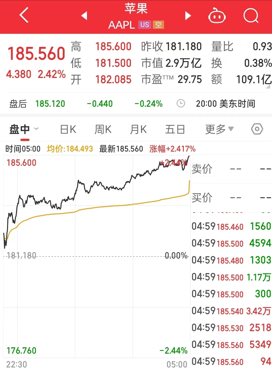 苹果当天美股开盘后股价上涨超过1%,收涨2.4%。