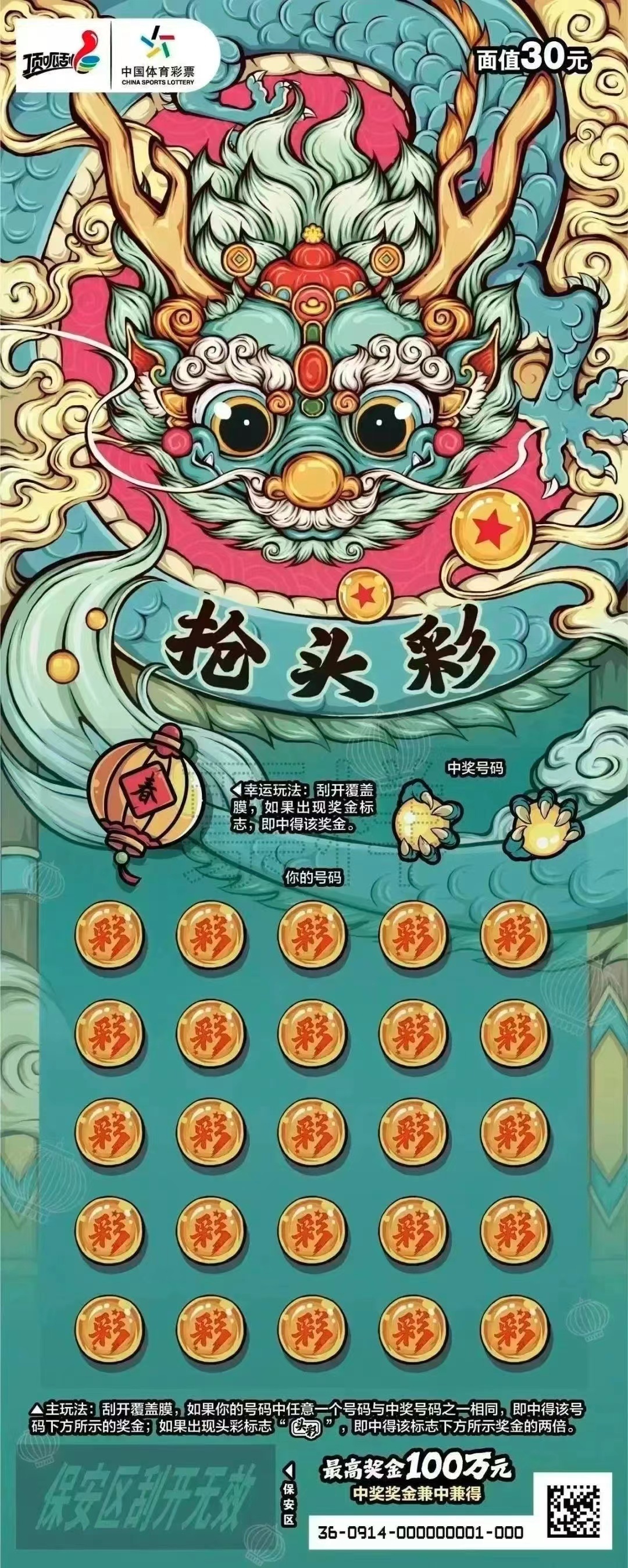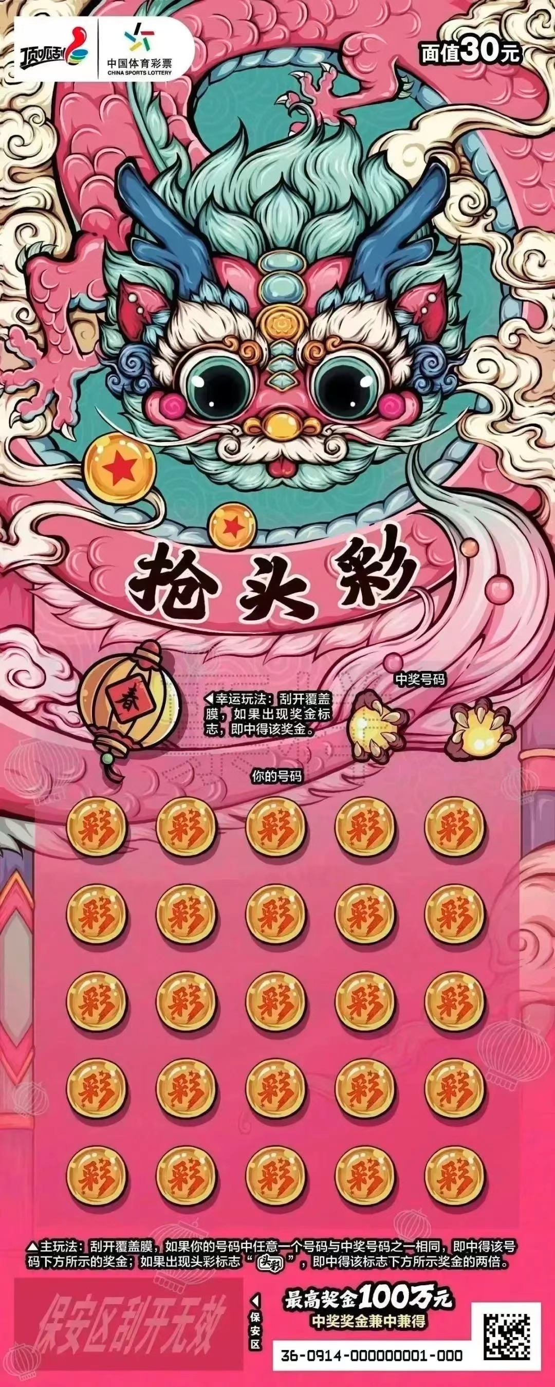这是体彩顶呱刮首款30元生肖主题票,满足了不同购彩者的需求,让人爱不释手。