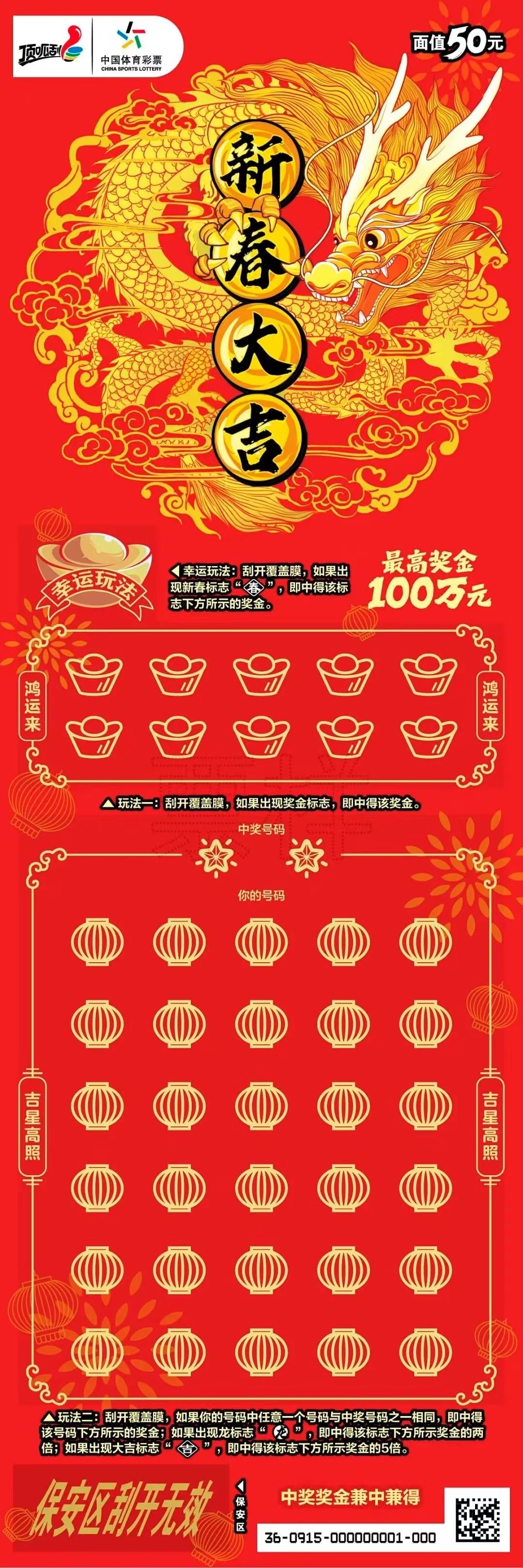 票面上的龙形象威武庄重,与金色的祥云、灯笼等元素相互映衬,并搭配新春大吉主题,传递给购彩者满满的新春祝福。