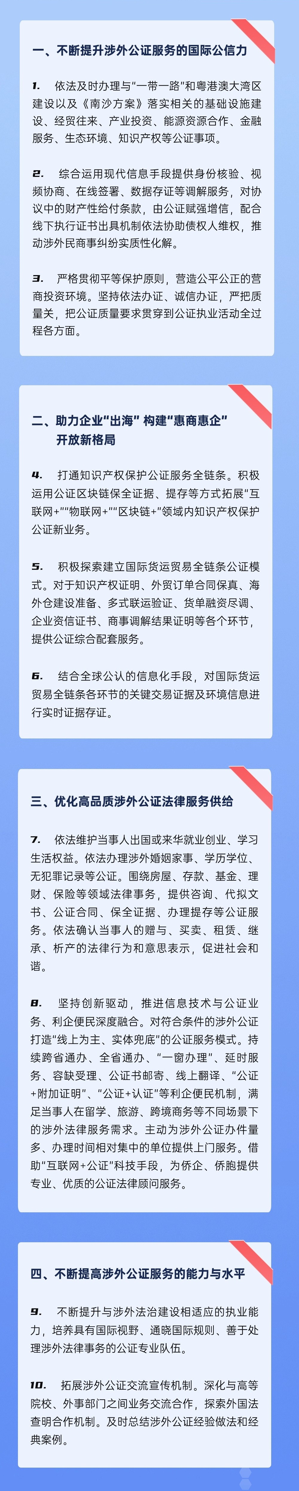 这次发布的举措共10条重点关注涉外法治建设需求,为国家战略和区域发展,推动涉外民商事纠纷实质性化解,严格贯彻平等保护原则,优化涉外知识产权公证服务流程,全链条服务国际货运贸易,数字化实时存证外贸数据,强化民生公证权益保障,推进信息技术与公证便民利企深度融合,加强人才培养和拓展公证对外宣传交流提供助力。