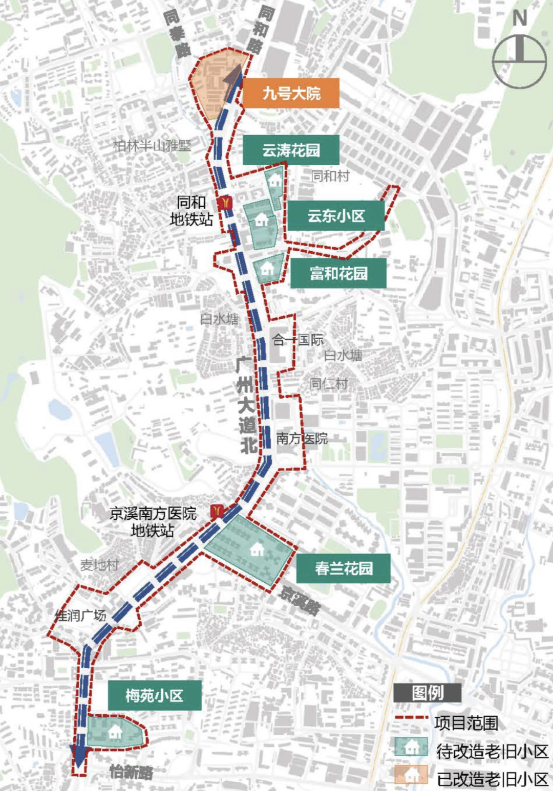同和片区位于白云山东麓,本次改造范围约56.30公顷,北至同和路,南至怡新路,广州大道北贯穿而过,拥有同和、京溪南方医院两个地铁站,片区内云集了南方医院、一五七医院等三甲医院,毗邻白云山、松园宾馆,是主城区南北连通的重要界面。片区人口年龄较为年轻,20-50岁青壮年占比超过70%。片区分布了6处老旧小区,建成时间都是二十世纪九十年代,其中5处有待提升改造。