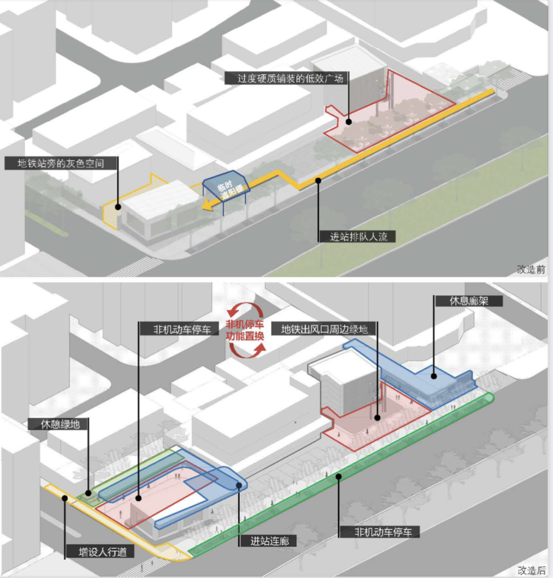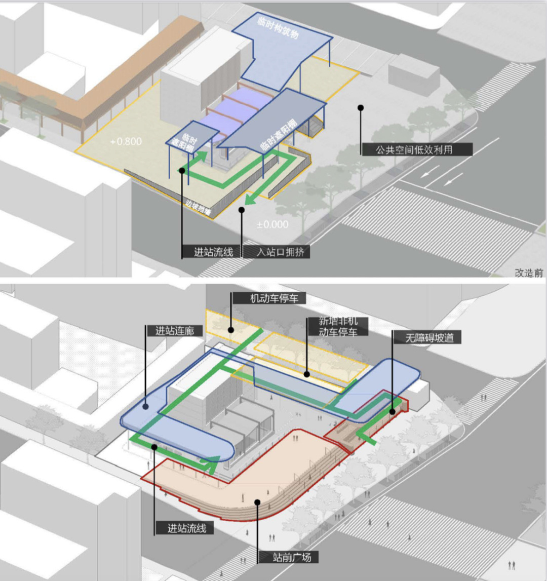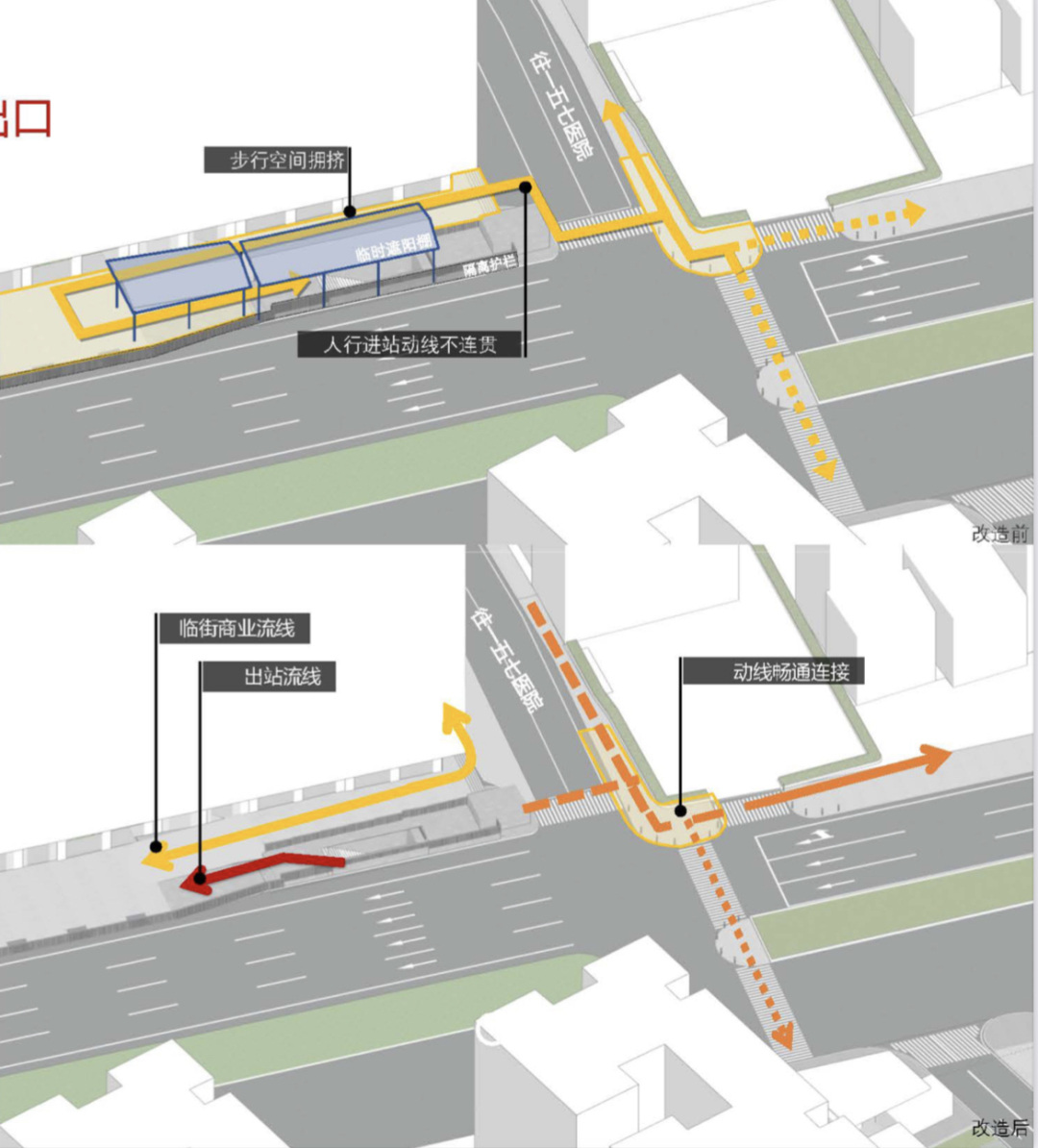 同和站C口将拆除临时工棚和围墙,增设进站连廊方便客流控制,将出风口的非机动车停车空间与站后广场空间置换,减少非机动车停车造成的城市界面混乱,利用街角空间设计休憩绿地。D口也将增设进站连廊,扩大站前广场,新增非机动车停车区域,调整后,地铁进站等候区或由面向马路一侧转为背向马路的一侧。
