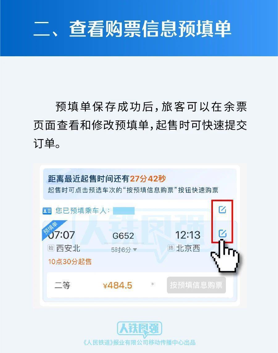 旅客朋友可于车票起售当日,预先填写乘车人、车次、席别等信息,在车票开始发售时一键提交订单并完成支付,使旅客购票更便捷。