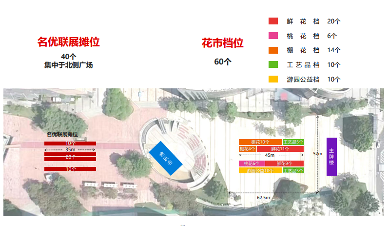 另外,2024年黄埔区迎春花市绿轴广场分会场花市棚架以《龙腾埔跃,湾顶领航》为主题,拟设花档棚架共60个,分为鲜花档20个,桃花档6个,棚花档14个,工艺品档10个,游园公益档10个,总长约200米。在北侧广场还设置名优联展摊位40个。