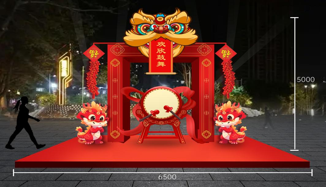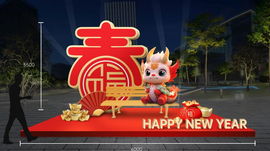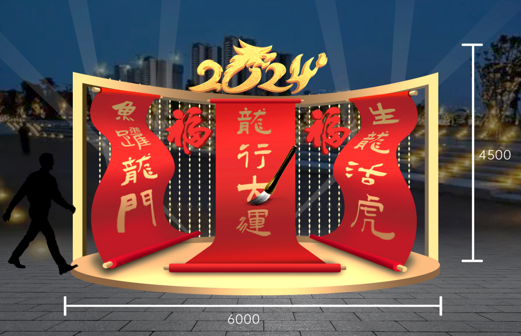为突显浓浓年味,营造喜庆等新春氛围,现场还有灯饰美陈一组三个,以欢欣鼓舞过新年、祥龙献福、龙年挥毫为主题,美陈高度约为5米/个,宽度约为6米/个,风格一致,使用喜庆中国红作为主色调,结合舞狮、打鼓、生肖龙、对联、灯笼等新春元素烘托欢乐的新春氛围。