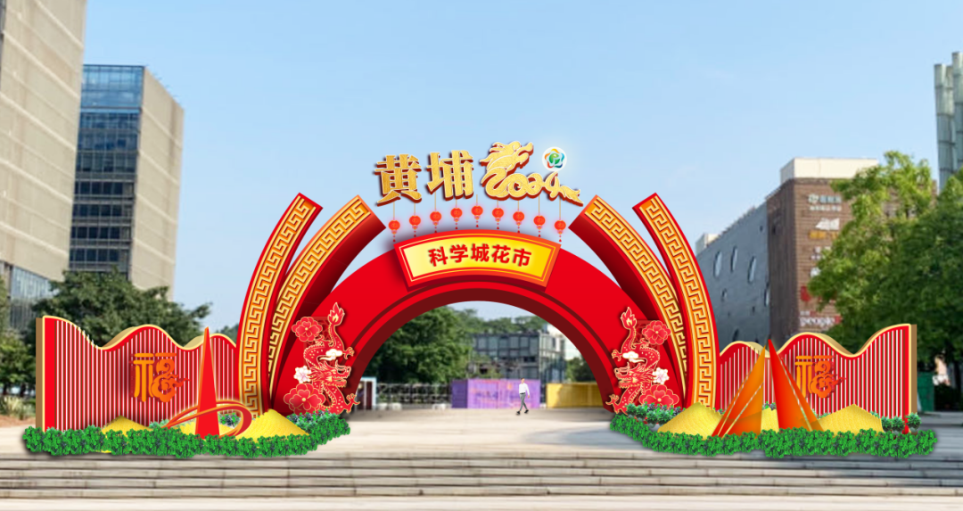 2024年广州传统迎春花市正在紧锣密鼓筹备中,根据黄埔区住房城乡建设局(广州开发区建设和交通局)发布的招标公告,2024年黄埔区迎春花市绿轴广场分会场主牌楼示意图如下图。