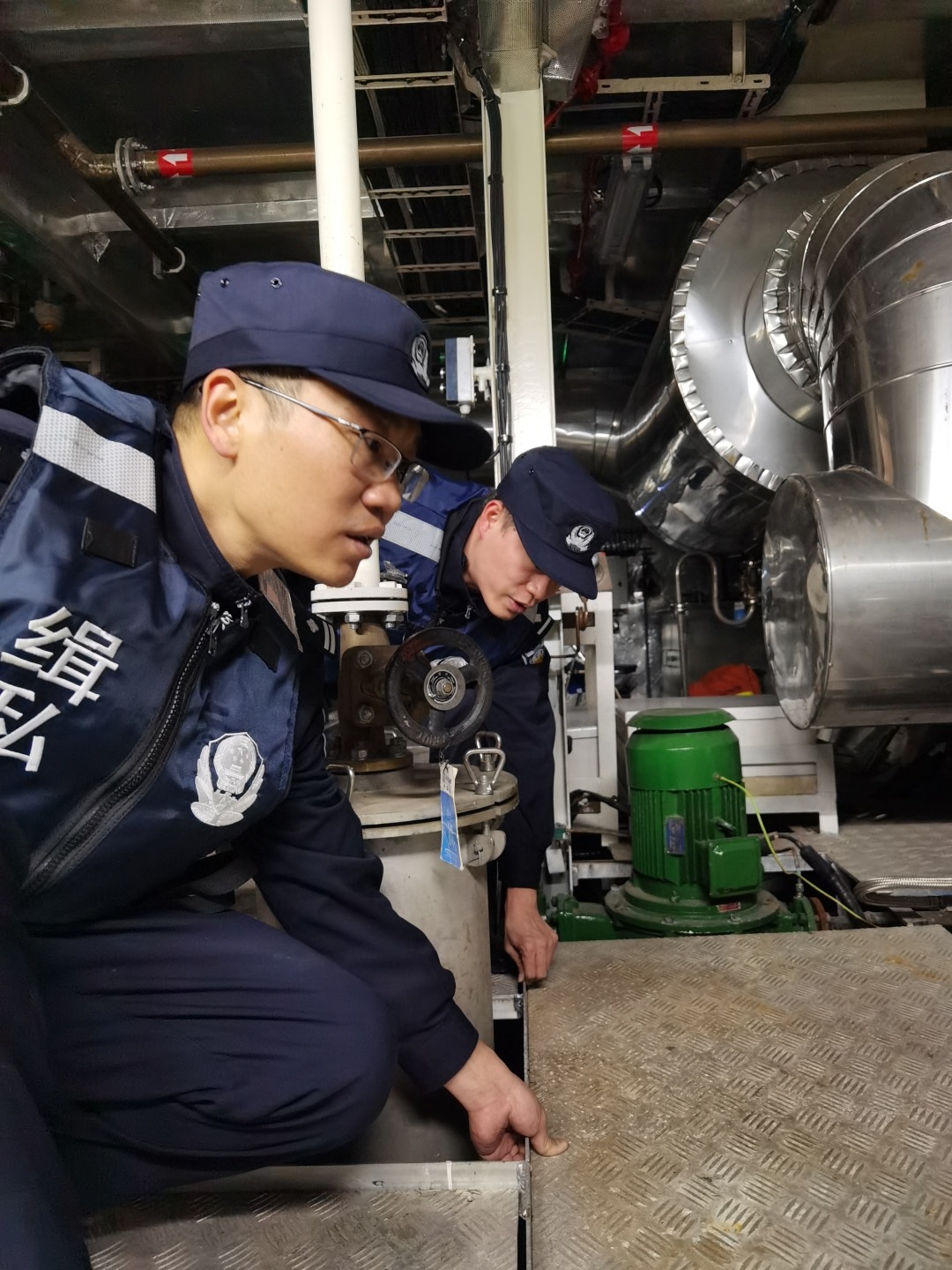 朱奕耿(左一)和同事在检查嫌疑船只暗格。