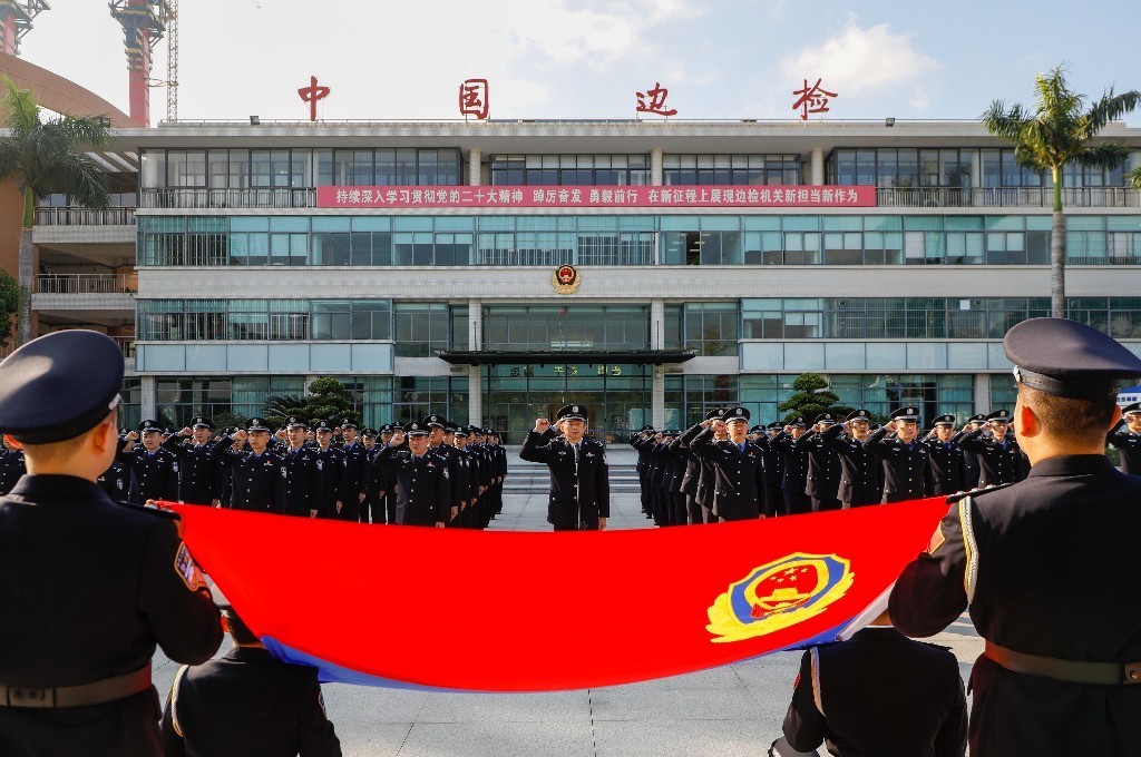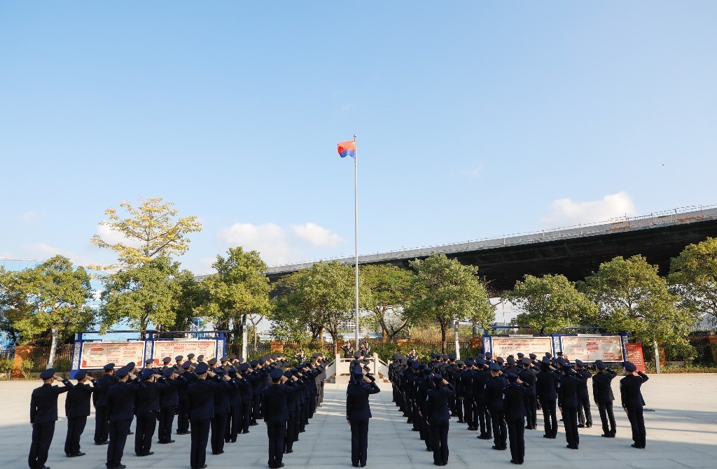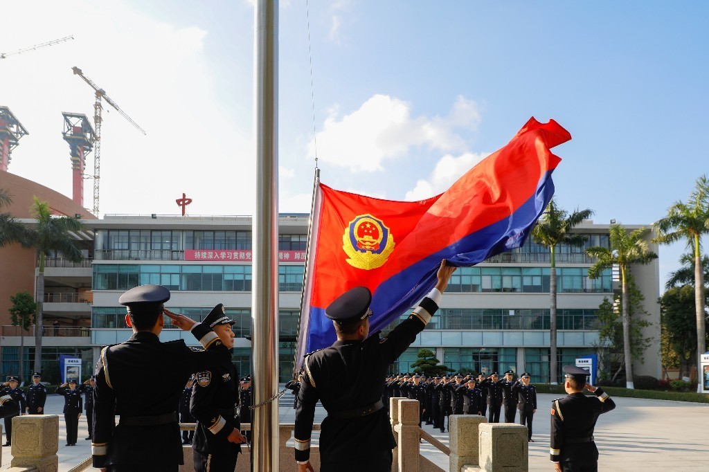 上午9时,顺德边检站警营广场上,移民管理警察警容严整、列队肃立,5名身着警礼服的移民管理警察护卫中国人民警察警旗,步伐整齐走向升旗台前。警旗伴随着《人民警察警歌》激昂的旋律冉冉升起,移民管理警察满怀激情共同唱响顺德边检忠诚于党的理想信念和服务人民的价值追求。