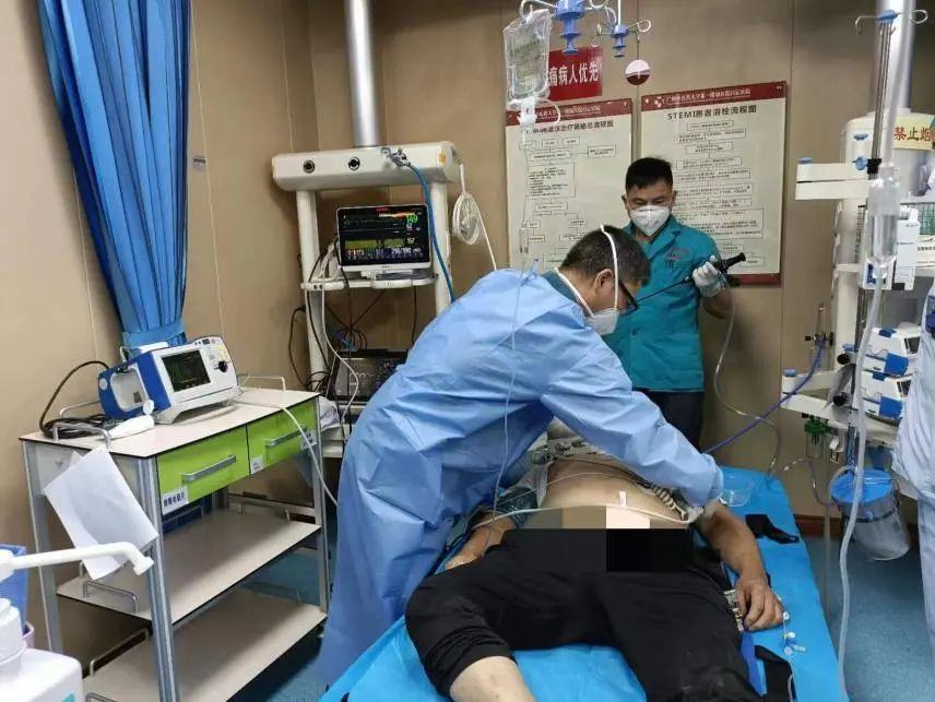 在抢救室里,心电监护的波形跳动牵动着在场每一个人的心。伍树潜指挥医护人员轮流为患者进行胸外按压、呼吸球囊辅助通气、吸痰、建立多条静脉通路、纤支镜气管插管等操作。