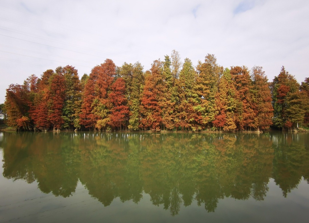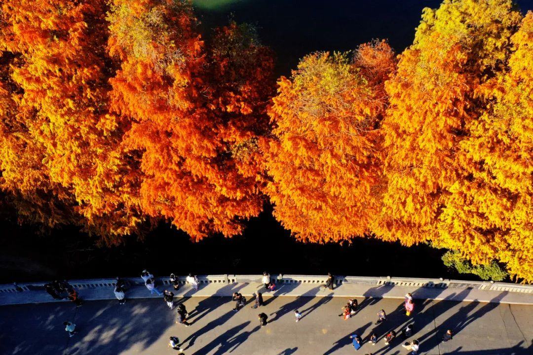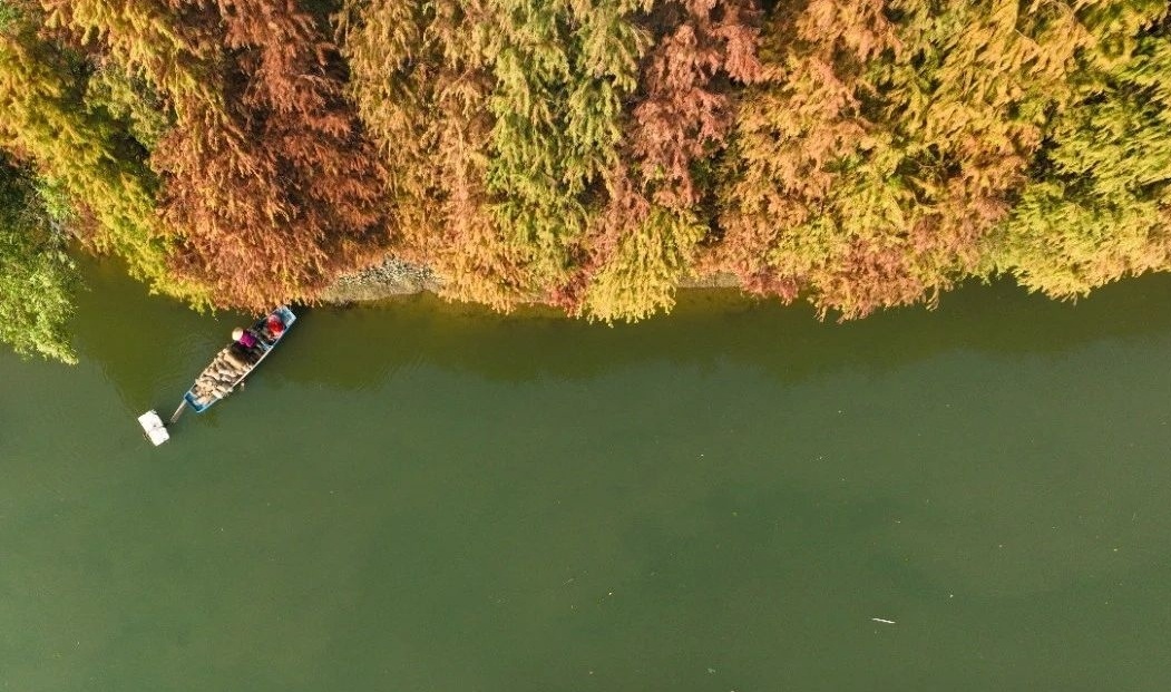 一排排落羽杉、水杉尽情展示一年中最美的妆容。夕阳西下,水杉林泛着金光,鎏金叠翠,勾勒出绚丽多彩的冬日画卷。远远望去,水光荡漾着火红“浓妆”,宛如大自然无意间打翻的调色盘。