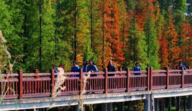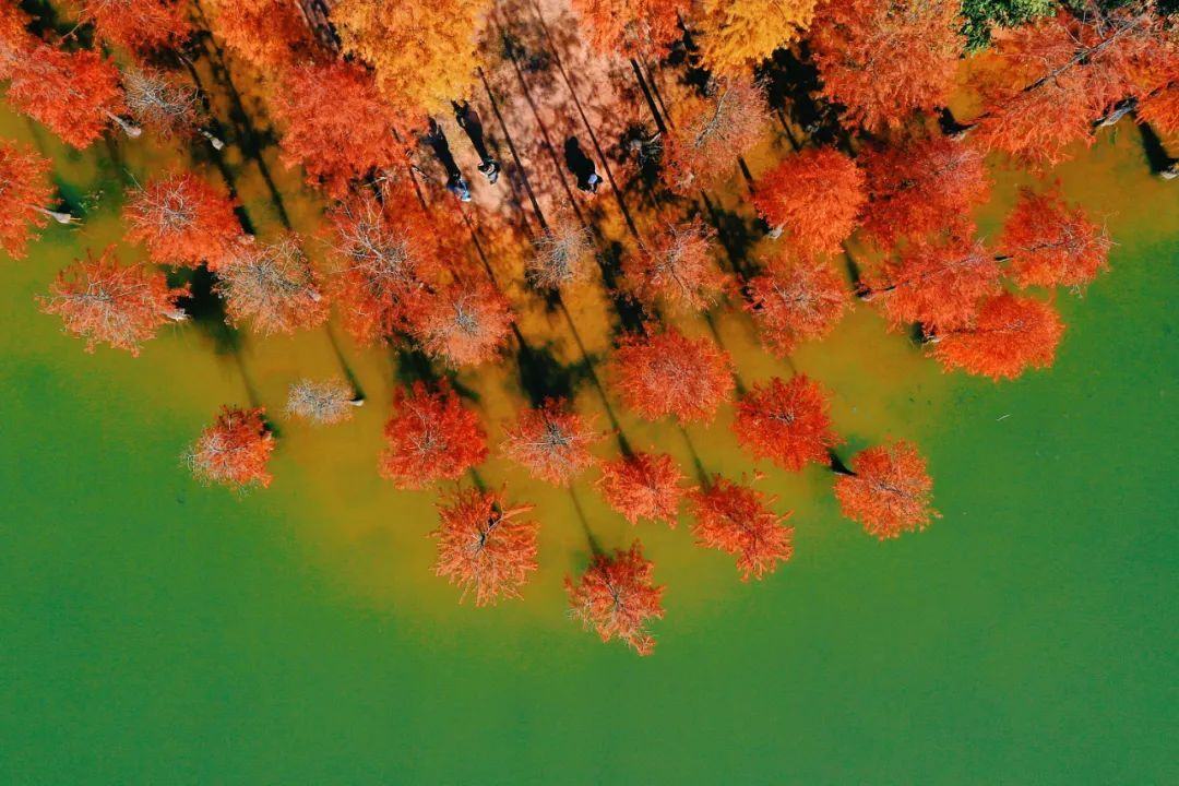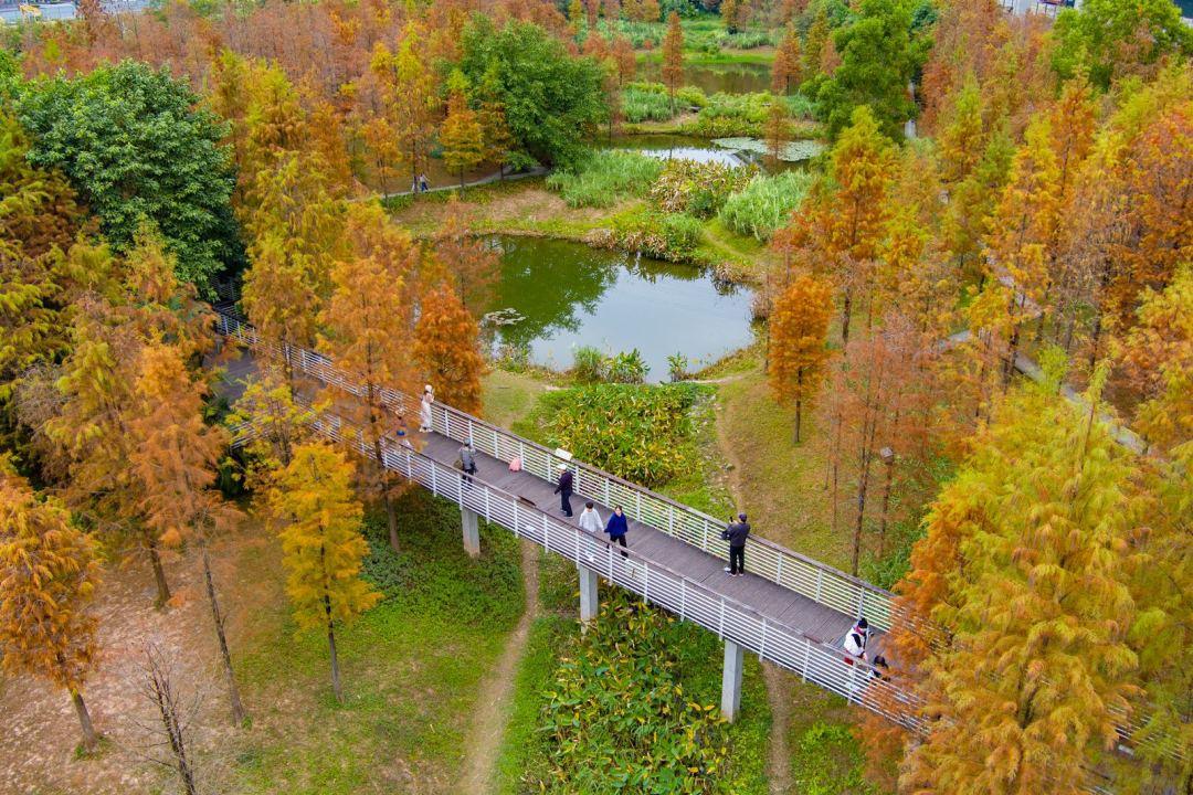 天河湿地公园的落羽杉也变身成为热门的打卡点。这里的落羽杉主要分布在公园北部两侧,走进公园,沿着木栈道前行,两旁皆是“染红”了的树林。