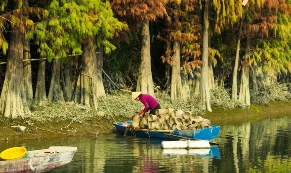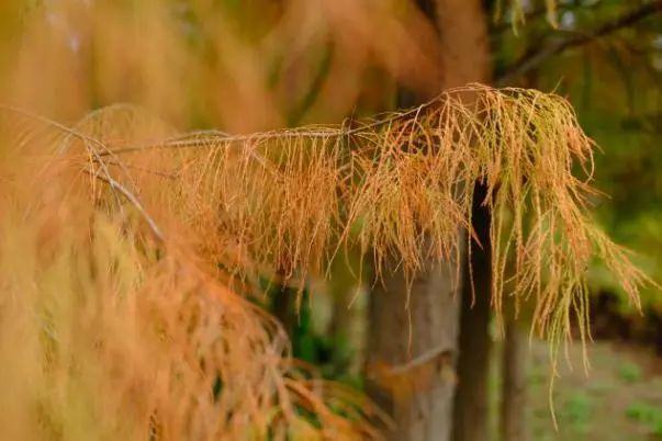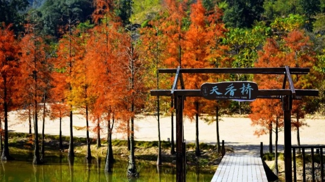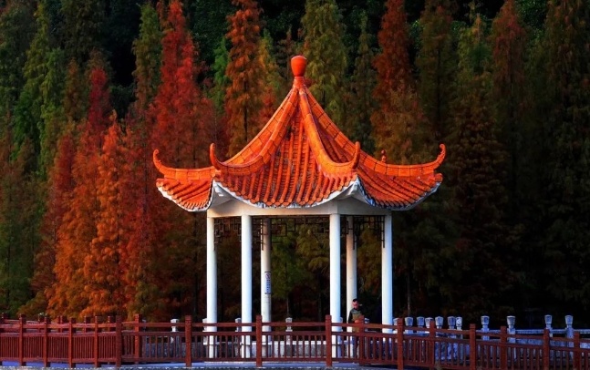 在凤凰湖放眼望去,落羽杉融入在一片湖光山色之中,宛若油画般梦幻惊艳。青翠的绿植与金黄的落羽杉,分立在湖两旁,仿佛隔开了夏天和冬天两个季节。色彩斑斓的落羽杉宛如大自然间打翻的调色盘,漫步其中,可以品味冬日的浪漫。