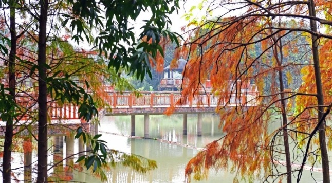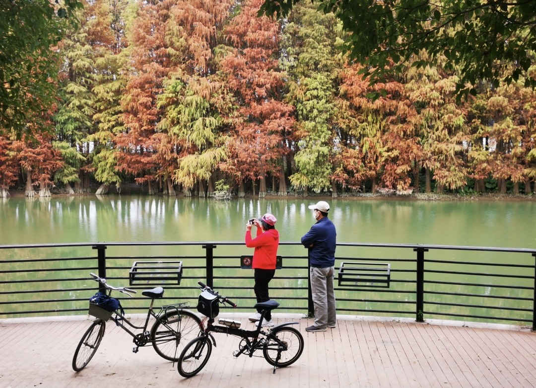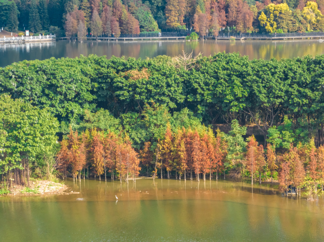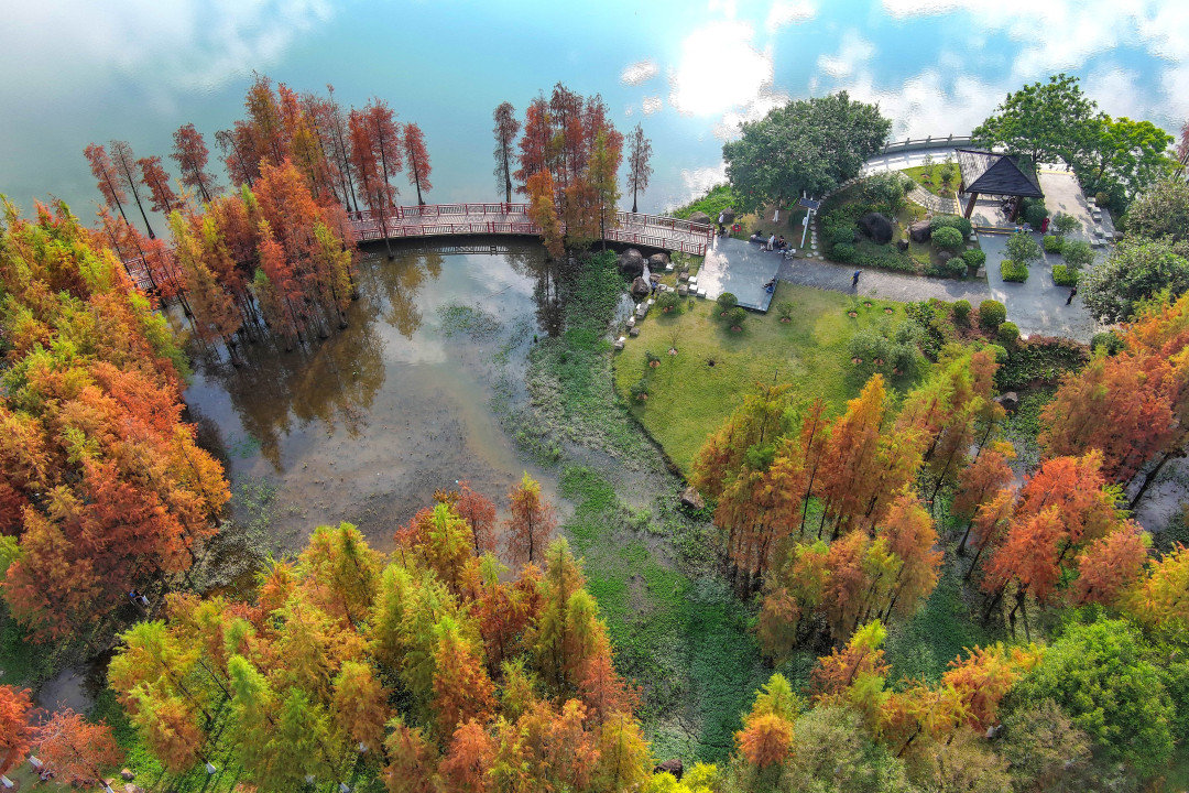 眼下的花都湖国家湿地公园内秋意正浓,沿着湖中栈道两旁错落生长的一棵棵落羽杉已基本转红,有的已渐成褐色,与四周的楼宇、绿植、水光山色交相辉映构成了一幅别样画卷,吸引了不少进园游玩的市民纷纷掏出手机,定格下这幕醉人美景。