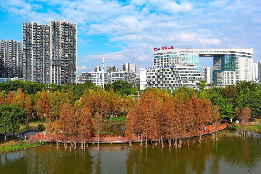 冬日的中新广州知识城上演着一场色彩盛宴。每年12月至次年1月,受气候变化影响,落羽杉会从绿色过渡为黄色,渐渐变为红色直到飘落。