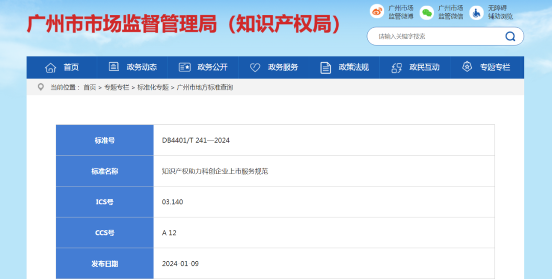 1月9日,广州市市场监督管理局(知识产权局)正式批准发布《知识产权助力科创企业上市服务规范》地方标准(以下简称《规范》),该标准是国内首个科创企业上市知识产权服务规范地方标准,将于2024年2月9日起实施。