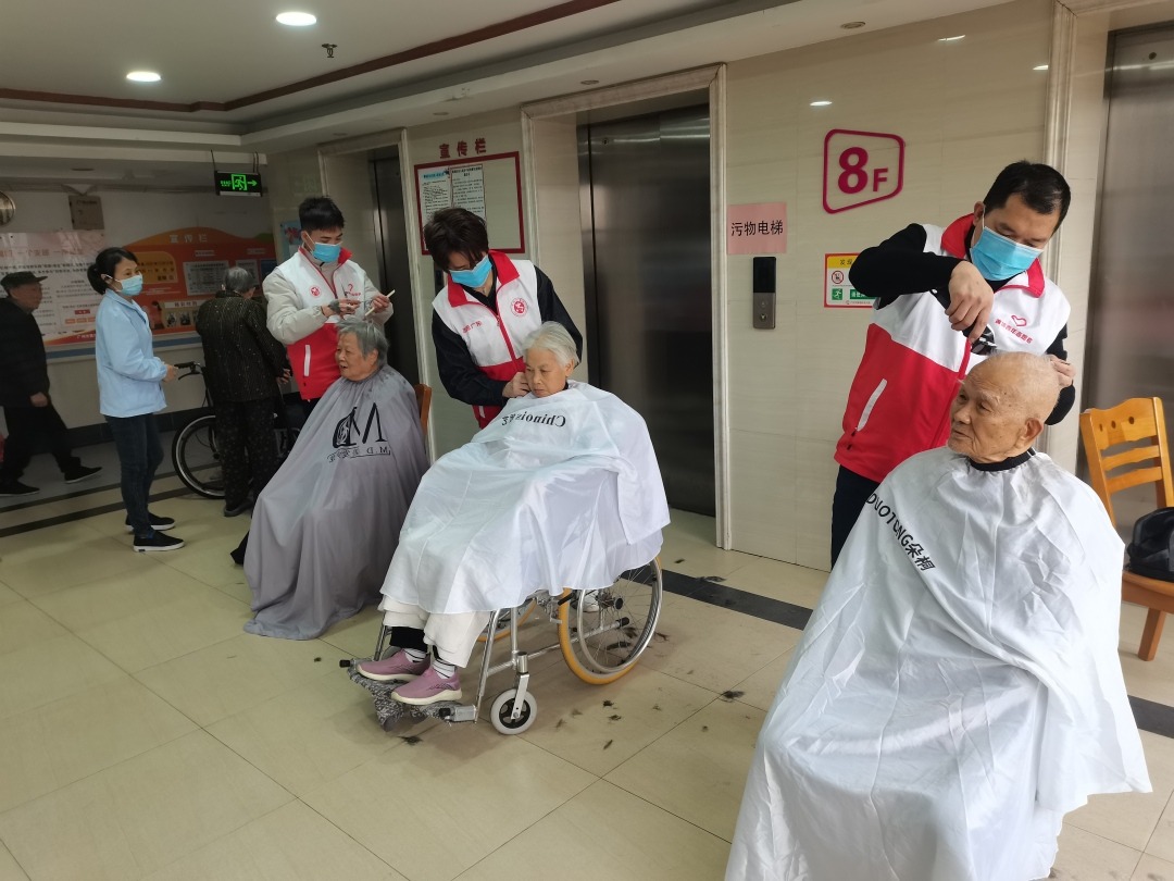 志愿者们在春节前为老人理发