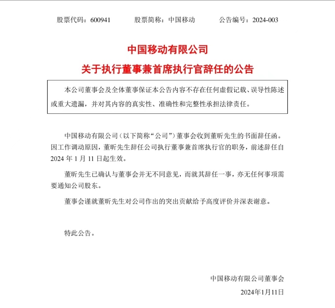 1月11日晚间,中国移动发布公告称,公司董事会收到董昕先生的书面辞任函。因工作调动原因,董昕先生辞任公司执行董事兼首席执行官的职务,前述辞任自2024年1月11日起生效。