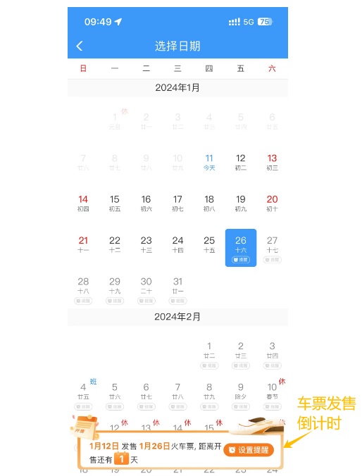 旅客可根据车票起售时间,提前通过系统设置多个提醒以便及时提交购票订单。设置提醒后,会在车票起售前通知旅客。