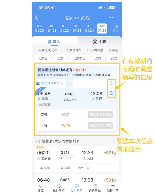 预填成功后,预选的车次会在余票列表页面置顶显示。到起售时间点时,可在余票页面快速提交订单。