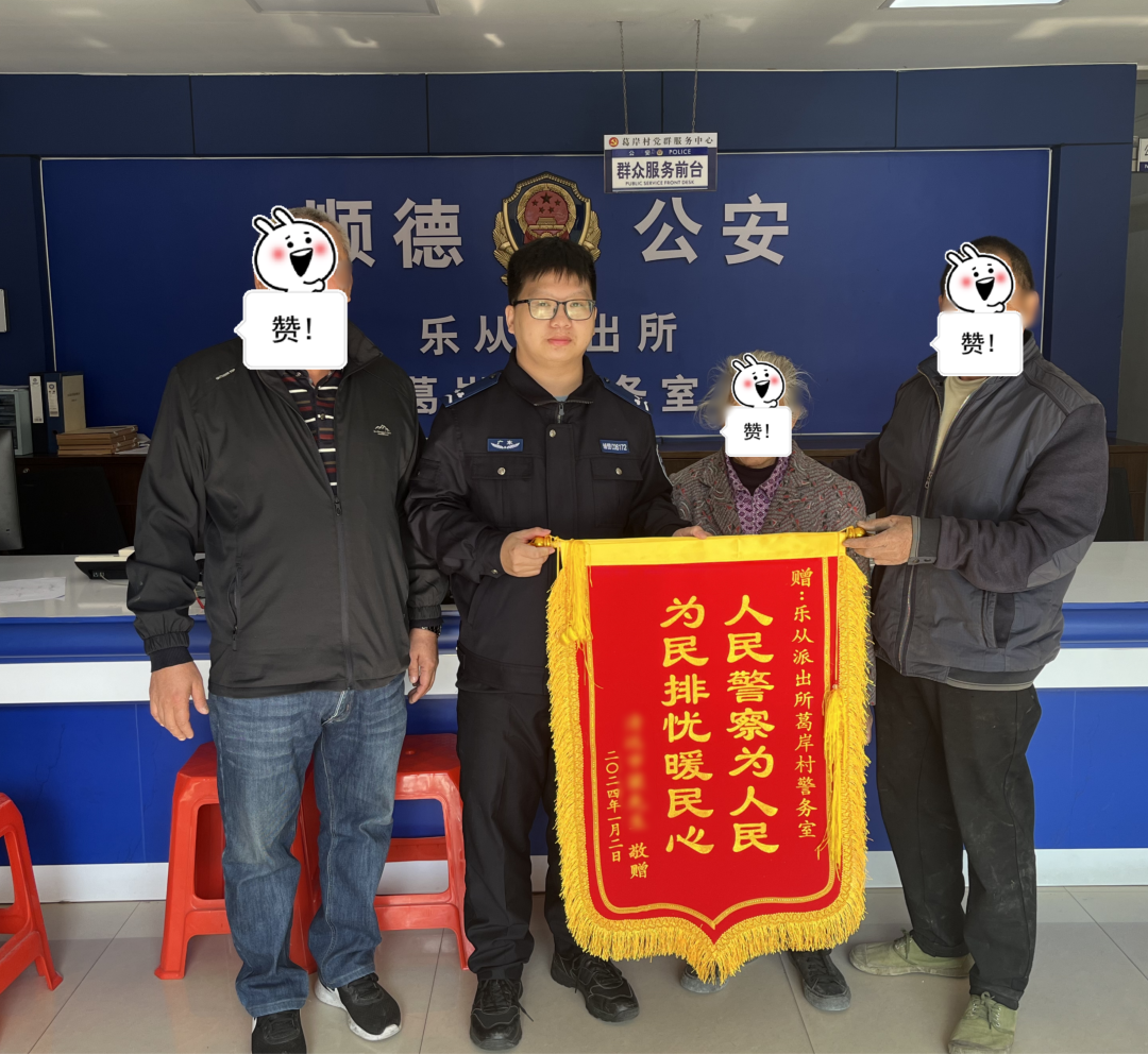 2024年1月2日,乐从派出所接到热心群众报警称,在乐从镇第三工业区附近有一位老人独自坐在路边,神情恍惚,急需帮助。接到报警后,葛岸警务室民警立即出警,发现老人年事已高,言语支吾,一时无法问清其姓名、住址、家人等基本情况。为了老人安全着想,民警先将老人接回警务室安顿。经仔细排查、多方打听,民警成功联系上老人的儿子梁先生。梁先生得知情况后,立刻赶来警务室。看到父亲安然无恙,他激动地表示:“我父亲今年80岁了,时而清醒时而糊涂,当天早上独自出门散步后迷路了,幸亏有你们帮忙!”次日上午,梁先生将一面锦旗送到葛岸警务室民警手中,感谢民警的暖心举动和及时帮助。