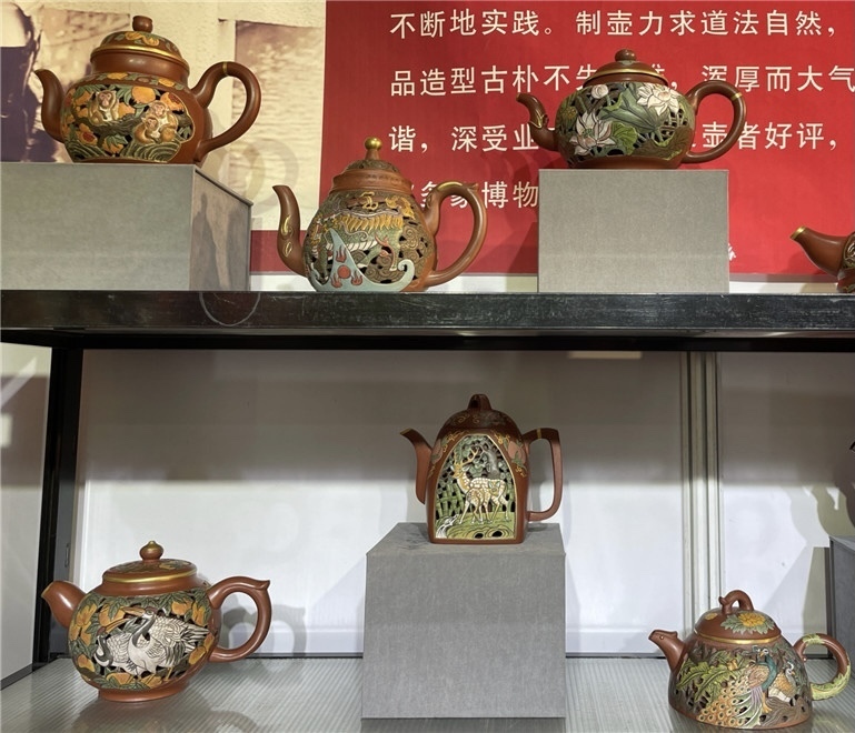 佳茗配雅器,锦上添花。现场展出了宜兴紫砂壶、坭兴陶壶、建水紫陶、建盏、景德陶瓷、龙泉青瓷、河南钧瓷、根雕字画等精美茶具,为市民提供“一站式”的茶品茶具选购体验。其中一组精美的镂空茶壶,吸引了记者的注意。工艺美术师、中国收藏协会理事、紫砂非遗传承人庄涵向记者介绍,这组茶壶是她特意为参展本届番禺茶博会所设计,“这组宫廷风格的茶壶,利用镂空和浮雕设计,采用的是泥绘手法。例如这款‘一团和气’,寓意祥和吉利;这款‘龙凤呈祥’,壶盖上画着‘龙凤’,壶身被十二生肖环绕,寓意着龙年大吉。”