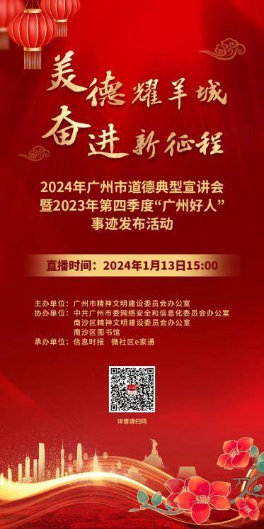 1月11日,2024年广州市道德典型巡礼活动在南沙区拉开帷幕。本次活动包括礼遇道德典型、新春送“福”慰问模范好人、“广州好人”事迹发布会等环节,旨在进一步发挥道德典型的引领和示范作用,讲好模范好人故事,弘扬道德典型崇高精神,推动全社会见贤思齐、崇尚英雄、争做先锋,营造德者有得、好人好报的良好氛围。