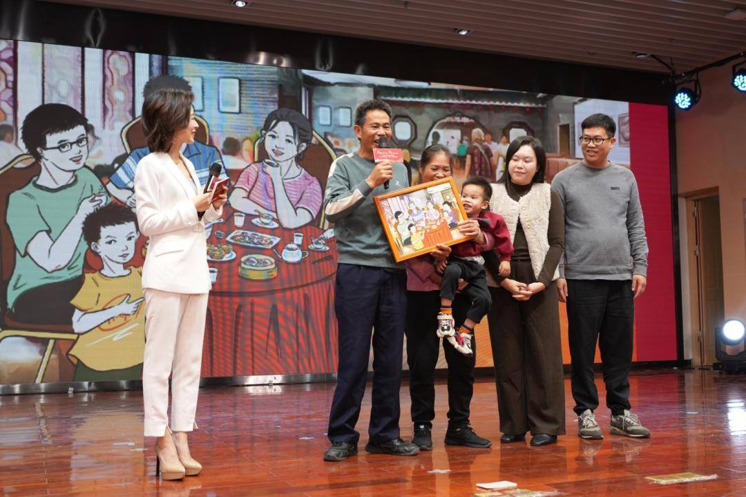 希望退休后能有更多的时间陪陪孙儿,和妻子一起喝喝早茶,是如今黄灿明的心愿。在宣讲员的讲述结束后,黄灿明一家受邀登上舞台。被黄灿明“燃烧自己、照亮别人”的灯塔精神感动,主办方为他送上一幅其乐融融喝早茶的漫画作品,祝其实现“微心愿”。