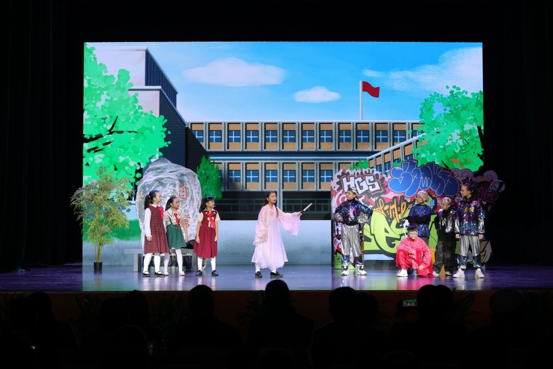 诗与歌,自古便是“绝配”。由吴非凡粤剧艺术工作室与广州凤凰湖小学联袂带来的一曲岭南童谣《南音颂湾区》,旋律悠扬,尽数湾区风情;获得今年诗歌季十佳诗作之一的《世界上的另一个我》也被改编为歌曲,令观众感受到诗歌中流露出的童心真趣;情景剧《神奇诗词变变变》里,孩子们用RAP的形式演绎诗歌,十分吸睛。剧中的古诗社和街舞社的小社员们因为争夺场地起了矛盾,却因对诗歌的共同热爱达成和解。小品告诉孩子们,诗歌不是死板的,而是鲜活的,可以随着生活的变化、时代的进步用不同的方式来表达。