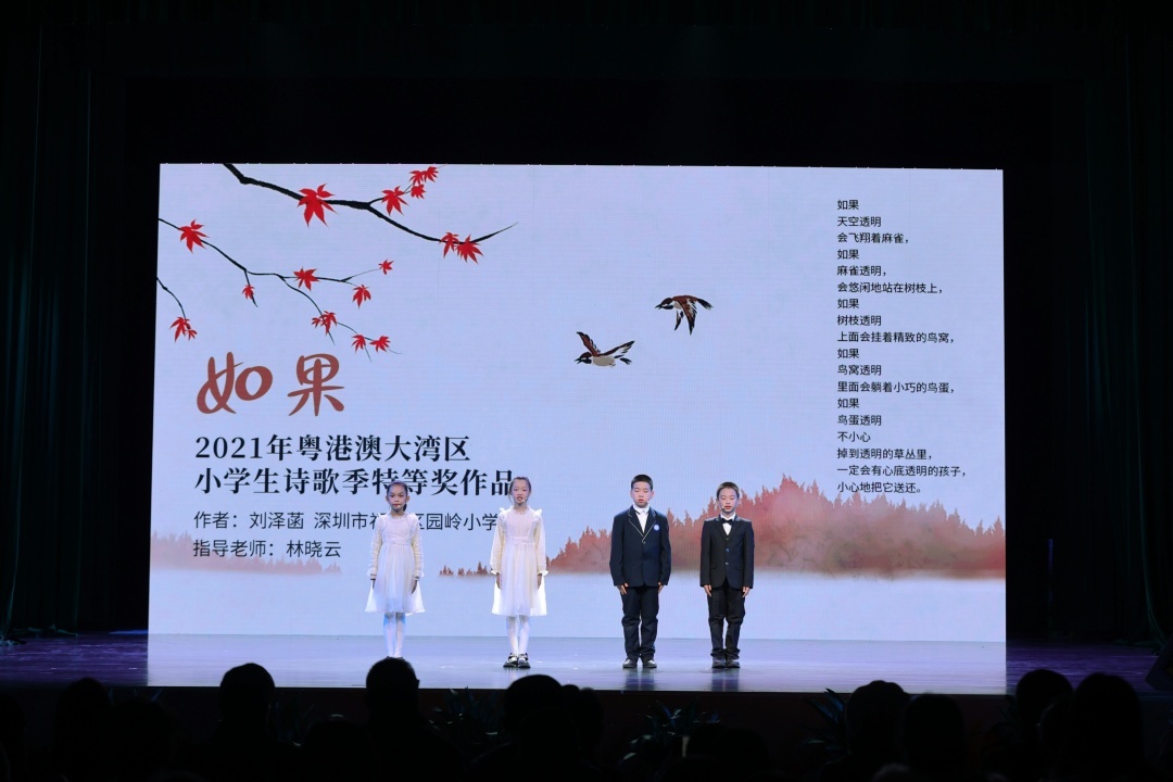 舞台上,出自小诗人之手的诗歌不仅仅停留在文字层面,更以各种创意迭出的方式绽放光彩。活动一开场,一条创意融媒视频就令人眼前一亮:来自粤港澳大湾区11座城市的18所小学的孩子们以“时空接龙”的形式,一同朗诵来自诗人杨克的经典名篇《我在一颗石榴里看见了我的祖国》。“我在一颗石榴里看见我的祖国,硕大而饱满的天地之果……”朗朗诗歌声穿越空间的阻隔,汇聚在一起,对祖国浓浓深情融进了三地学子的童声里。
