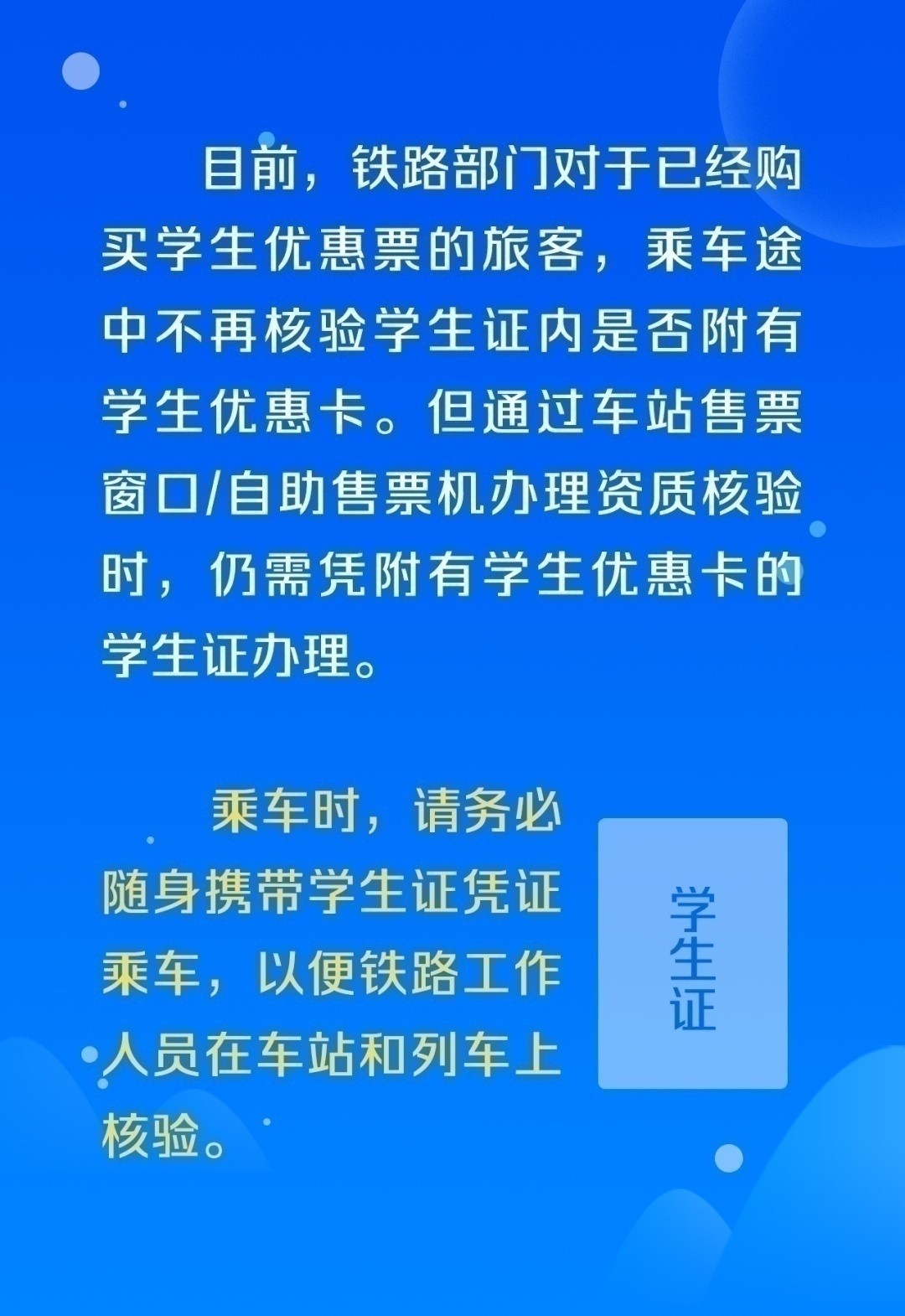 划重点!学生证减价优惠区间更改时,应重新加盖院校公章,并修改火车票学生优惠卡内相关信息。私自涂改则视为无效。
