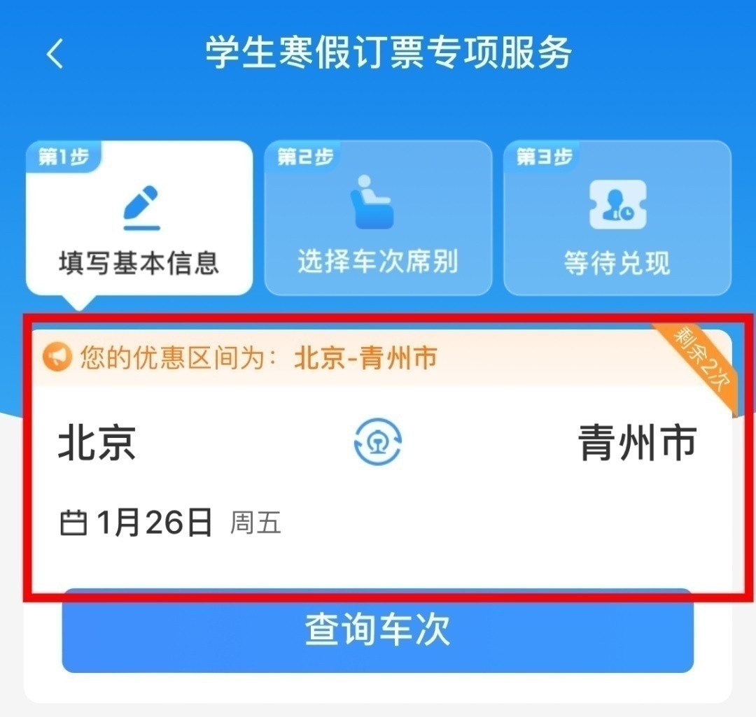 打开铁路12306App,进入“学生、务工人员春运预约订票专区”,点击“学生寒假订票专项服务”。系统将默认填写优惠乘车区间,并提示剩余优惠次数。